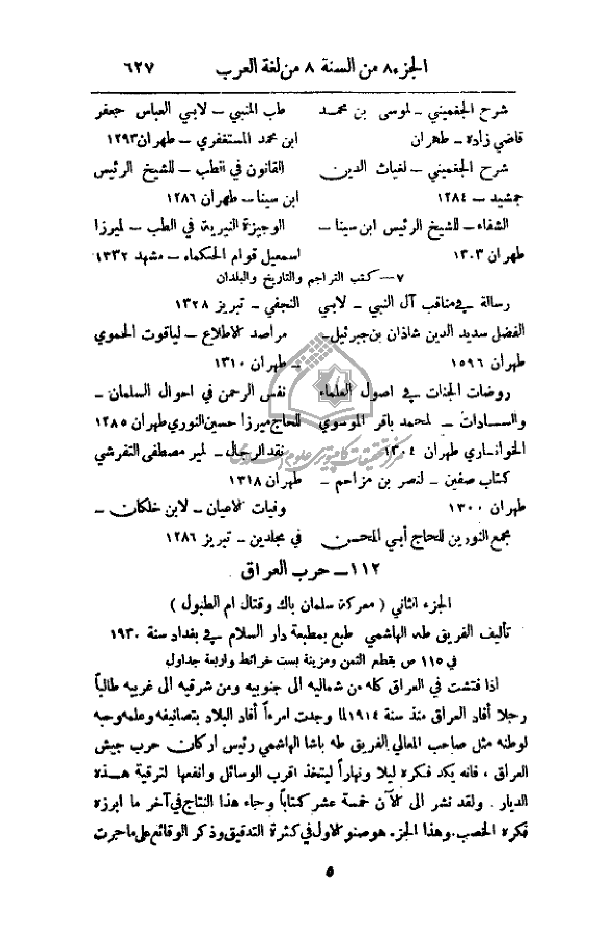العراق منذ سنة 1914 لما وجدت امرءواً أفاد البلاد بتصانيفه وعلمه وحبه لوطنه مثل صاحب المعالي الفريق طه باشا الهاشمي رئيس أركان حرب جيش العراق، فأنه يكد ليلاً ونهاراً ليتخذ أقرب الوسائل وأنفعها لترقية هذه الديار. ولقد نشر إلى الآن خمسة عشر كتاباً وجاء هذا النتاج في آخر ما أبرزه فكره الخصب وهذا الجزء وهو صنو الأول في كثرة التدقيق وذكر الوقائع على ما جرت