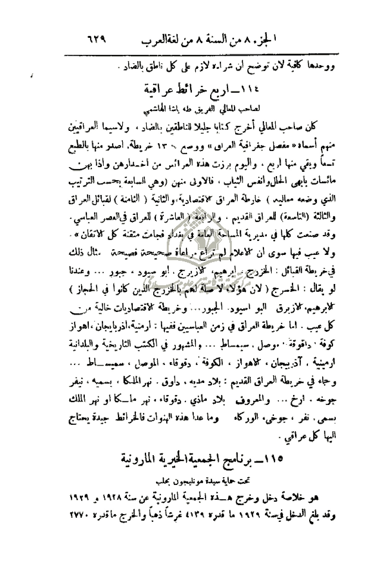 كان صاحب المعالي أخرج كتاباً جليلاً للناطقين بالضاد، ولا سيما العراقيين منهم أسماءه (مفصل جغرافية العراق) ووضع له 13 خريطة أصدر منها بالطبع تسعاً وبقي منها أربع، واليوم برزت هذه العرائس من أخدارهن وإذا بهن مائسات بأبهى الحلل وأنفس الثياب، فالأولى منهن (وهي السابعة بحسب الترتيب الذي وضعه معاليه) خارطة العراق الاقتصادية والثانية (الثامنة) لقبائل العراق والثالثة (التاسعة للعراق القديم. والرابعة (العاشرة) للعراق في العصر العباسي. وقد صنعت كلها في مديرية المساحة العامة في بغداد فجاءت متقنة كل الإتقان). ولا عيب فيها سوى أن الأعلام لم تراع مراعاة صحيحة فصيحة مثال ذلك في خريطة القبائل: الخزرج، إبراهيم، الأزيرج، أبو سيود، جبور. . . وعندنا لو يقال: الخسرج (لأن هؤلاء لا صلة لهم بالخزرج الذين كانوا في الحجاز) الإبراهيم، الأزيرق البو اسيود، الجبور. . . وخريطة الاقتصاديات خالية من كل عيب أما خريطة العراق في زمن العباسيين ففيها: أرمنية أذربيجان، أهواز كوفة داقوقة، موصل، سيمساط. . والمشهورة في الكتب التاريخية والبلدانية ارمينية، آذربيجان، الأهواز، الكوفة، دقوقاء، اتلموصل، سميساط. . . وجاء في خارطة العراق القديم: بلاد مديه، داوق، نهر الملكا، بسميه، نيفر جوخه. أرخ. . والمعروف: بلاد ماذي، دقوقاء، نهر ملكا أو نهر الملك بسمى، نفر، جوخئ الوركاء. . وما عدا هذه الهنوات فالخرائط جيدة يحتاج إليها كل عراقي.