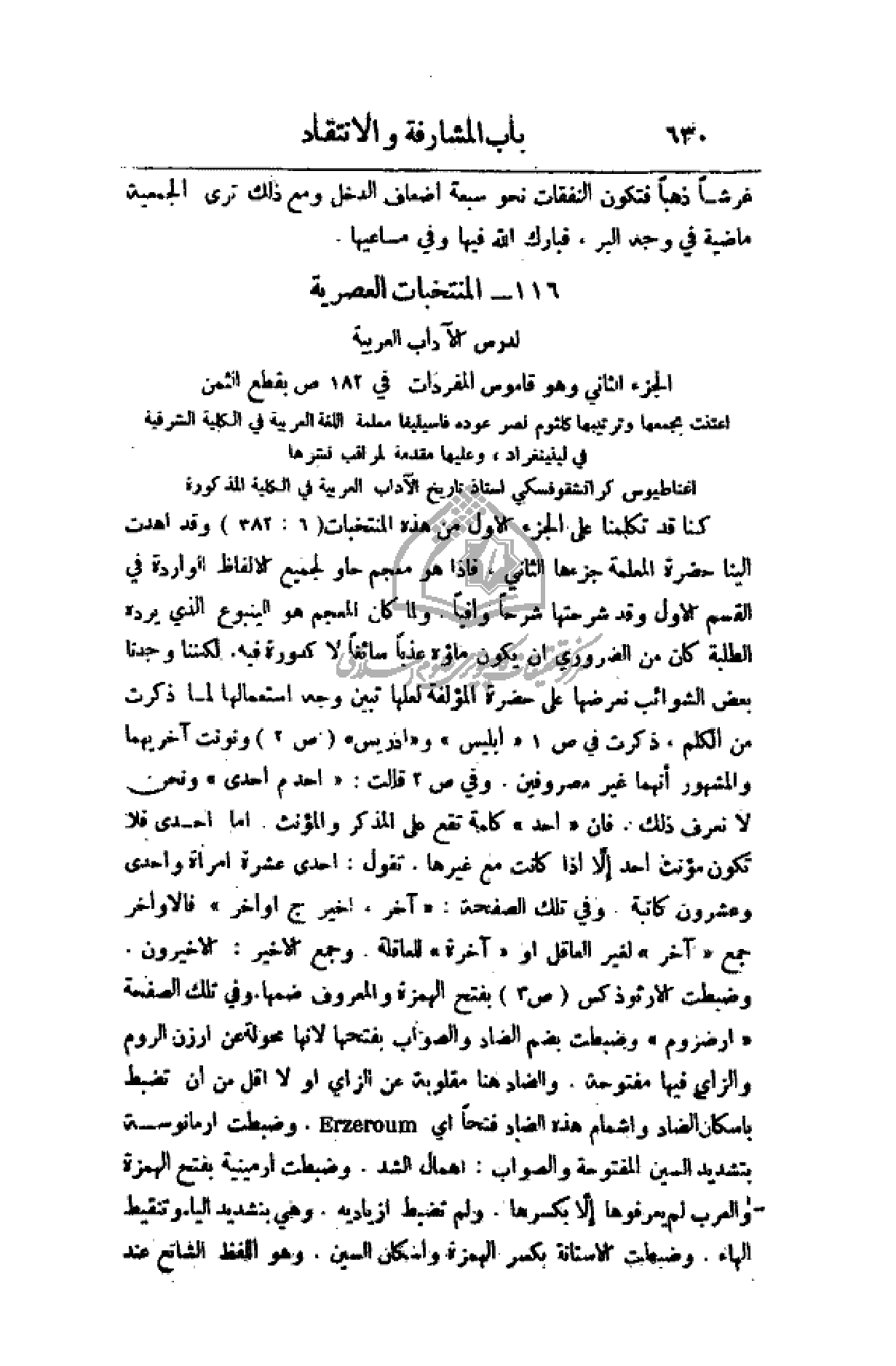 كنا قد تكلمنا على الجزء الأول من هذه المنتخبات (6: 382) وقد أهدت إلينا حضرة المعلمة جزئها الثاني، فإذا هو معجم حاو لجميع الألفاظ الواردة في القسم الأول وقد شرحتها شرحاً وافياً. ولما كان المعجم هو الينبوع الذي يرده الطلبة كان من الضروري أن يكون ماؤه عذباً سائغاً لا كدورة فيه لكننا وجدنا بعض الشوائب نعرضها على حضرة المؤلفة لعلها تبين وجه استعمالها لمل ذكرت من الكلم، ذكرت في ص1 (إبليس) و (إدريس) (ص 2) ونونت أخريهما والمشهورة أنهما غير مصروفين. وفي ص 3 قالت: أحدهم إحدى) ونحن لا نعرف ذلك. فان (أحد) كلمة تقع على المذكور والمؤنث. أما إحدى فلا تكون مؤنث أحد إلا إذا كانت مع غيرها. تقول: إحدى عشرة امرأة وإحدى وعشرون كاتبة. وفي تلك الصفحة: (آخر، أخير ج أواخر) فالأواخر جمع (آخر) لغير العاقل أو (آخره) للعاقلة. وجمع الخير: الأخيرون وضبطت الأرثوذكس (ص 3) بفتح الهمزة والمعروف ضمها وفي تلك الصفحة (ارضروم) وضبطت بضم الضاد والصواب بفتحها لأنها محولة عن ارزن الروم والزاي فيها مفتوحة. والضاد هنا مقلوبة عن الزاي أو لا أقل من أن تضبط بإسكان الضاد وإشمام هذه الضاد فتحاً أي وضبطت ارمانوسة بتشديد السين المفتوحة والصواب: إهمال الشد. وضبطت أرمينية بفتح الهمزة والعرب لم يعرفوها إلا بكسرها. وهي بتشديد الياء وتنقيط الهاء. وضبطت الآستانة بكسر الهمزة وإسكان السين. وهو اللفظ الشائع عند