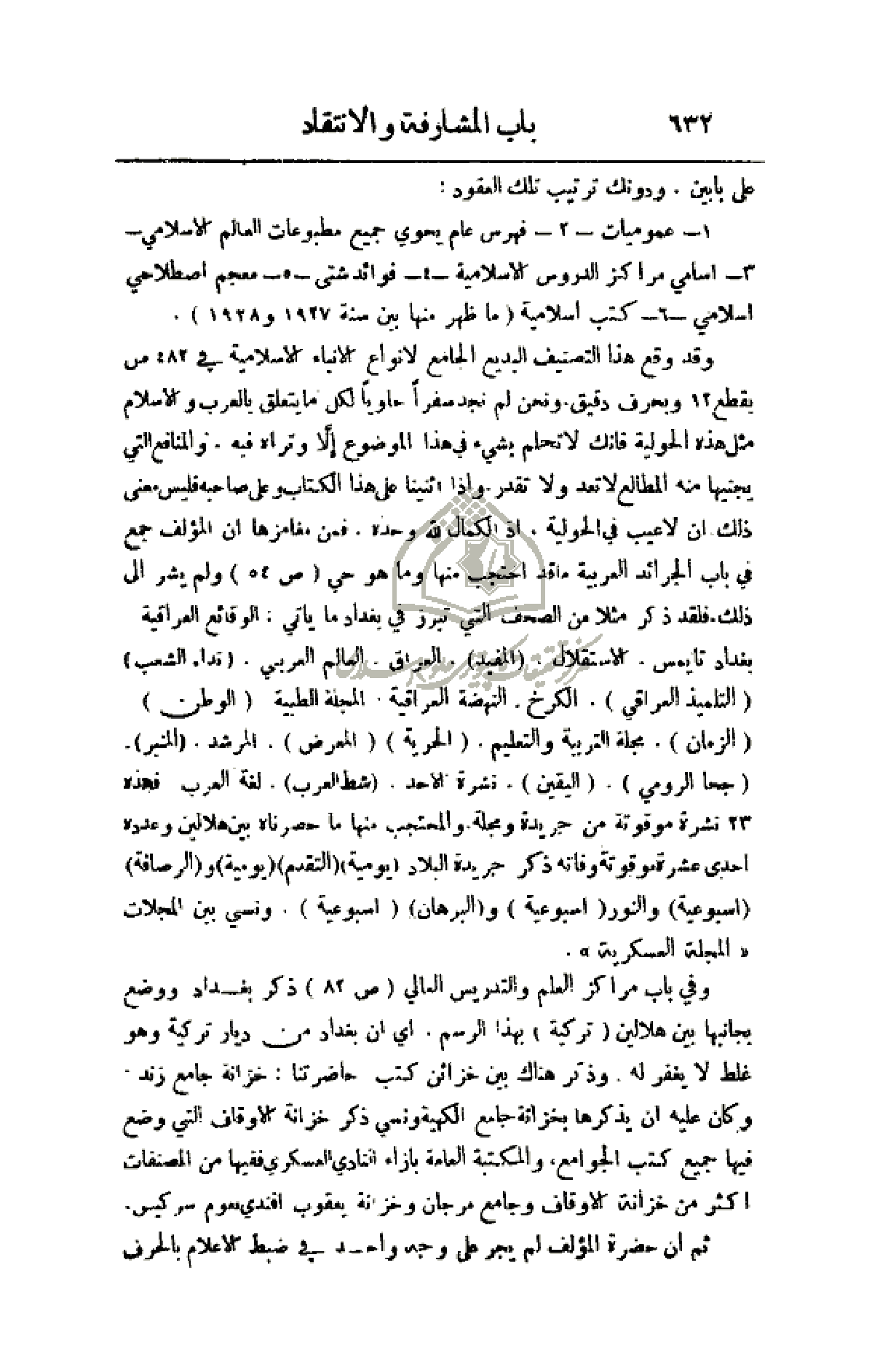 وقد وقع هذا التصنيف البديع الجامع لأنواع الأنباء الإسلامية في 482 ص بقطع 12 وبحرف دقيق. ونحن لم نجد سفراً حاوياً لكل ما يتعلق بالعرب والإسلام مثل هذه الحولية فانك لا تحلم بشيء في هذا الموضوع إلا وتراه فيه. والمنافع التي يجنيها منه المطالع لا تعد ولا تقدر. وإذا أثنينا على هذا الكتاب وعلى صاحبة فليس معنى ذلك أن لا عيب في الحولية، إذ الكمال لله وحده. فمن مغامزها أن المؤلف جمع في باب الجرائد العربية ما قد احتجب منها وما هو حي (ص 54) ولم يشر إلى ذلك فلقد ذكر مثلاً من الصحف التي تبرز في بغداد ما يأتي: الوقائع العراقية. بغداد تايمس. الاستقلال. (المفيد). العراق. العالم العربي. (نداء الشعب) (التلميذ العراقي). الكرخ. النهضة العراقية. المجلة الطبية. (الوطن). (الزمان). مجلة التربية والتعليم. (الحرية) (المعرض). المرشد. (المنير). (حجا الرومي). (اليقين). نشرة الأحد. (شط العرب). لغة العرب فهذه 23 نشرة موقوتة من جريدة ومجلة. والمحتجب منها ما حصرناه بين هلالين وعدده إحدى عشرة موقوتة وفاته ذكر جريدة البلاد (يومية) (التقدم) (يومية) و (الرصافة) (أسبوعية) والنور (أسبوعية) و (البرهان) (أسبوعية). ونسي بين المجلات (المجلة العسكرية).