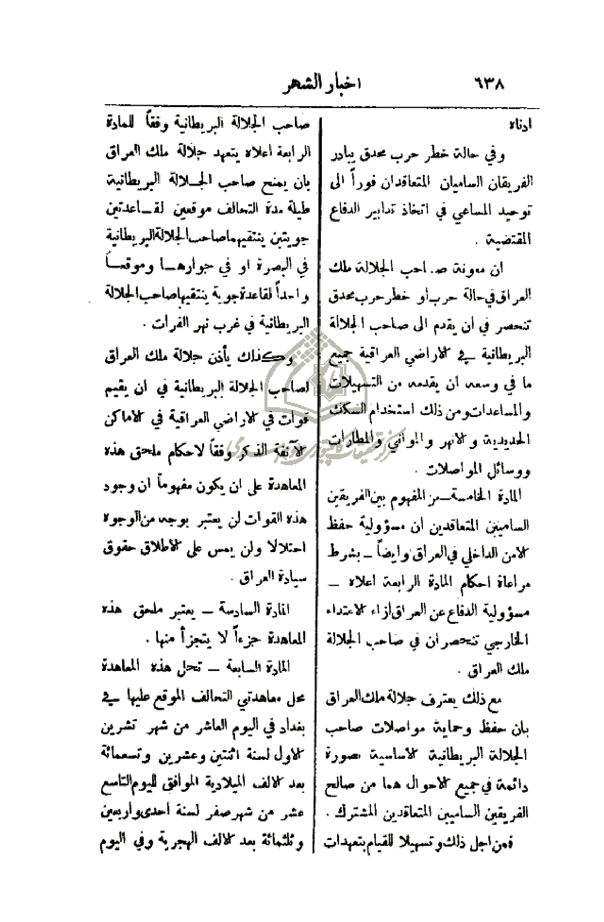 مع ذلك يعترف جلالة ملك العراق بأن حفظ وحماية مواصلات صاحب الجلالة البريطانية الأساسية بصورة دائمة في جميع الأحوال هما من صالح الفريقين الساميين المتعاقدين المشترك.