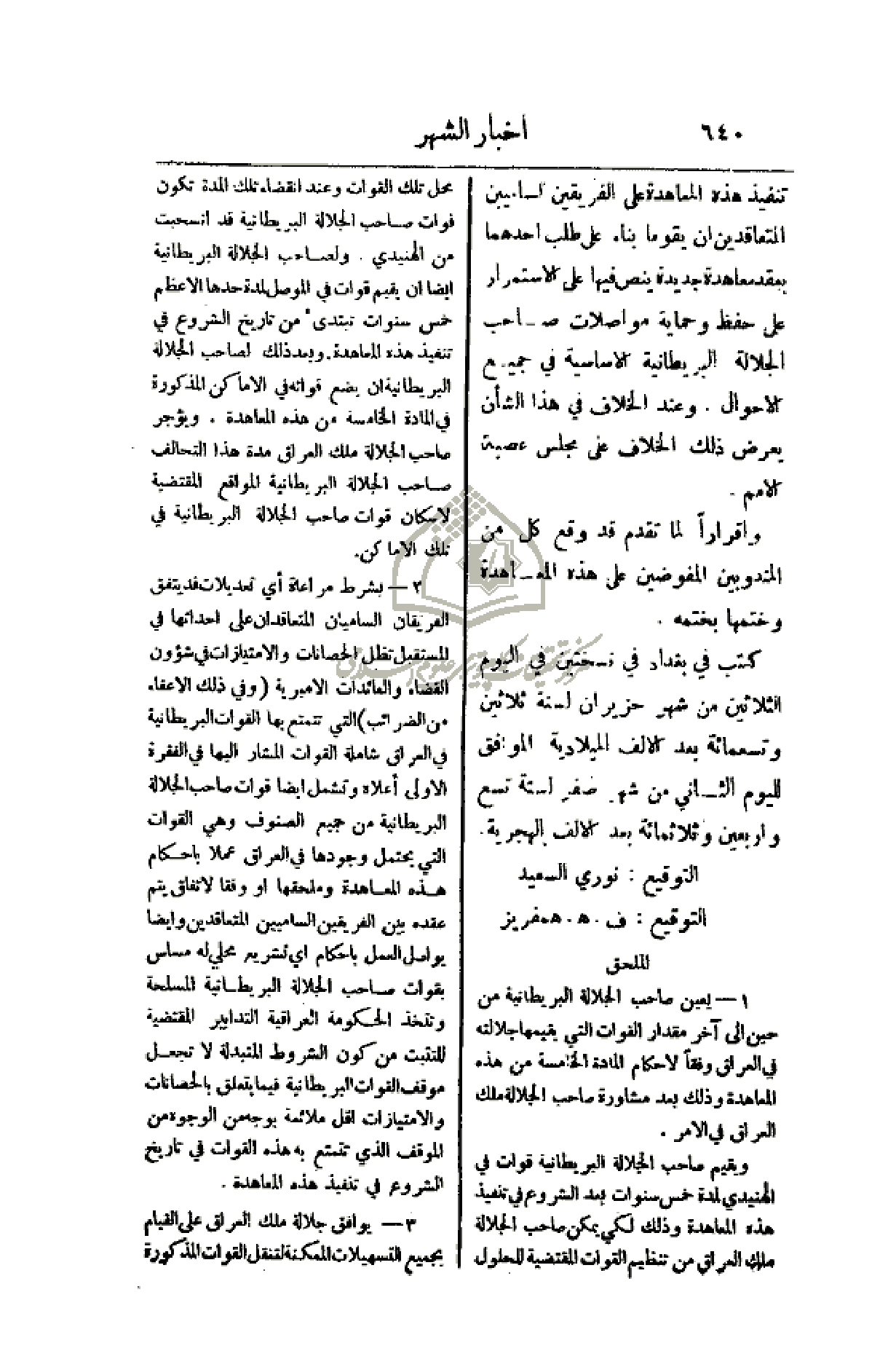 1 - يعين صاحب الجلالة البريطانية من حين إلى آخر مقدار القوات التي يقيمها جلالته في العراق وفقاً لأحكام المادة الخامسة من هذه المعاهدة وذلك بعد مشاورة صاحب الجلالة ملك العراق في الأمر.