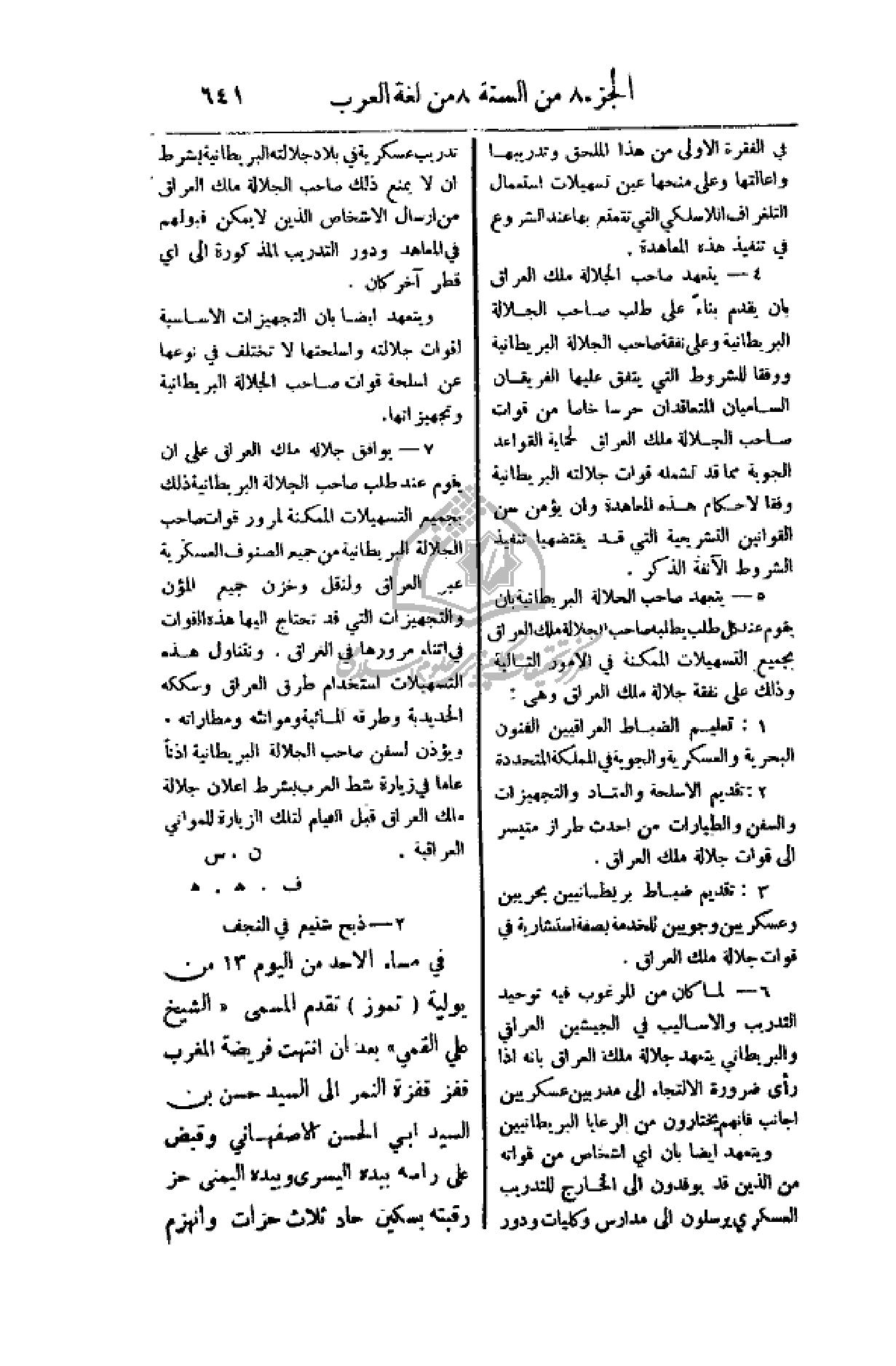 5 - يتعهد صاحب الجلالة البريطانية بأن يقوم عند كل طلب يطلبه الجلالة ملك العراق بجميع التسهيلات الممكنة في الأمور التالية وذلك على نفقة جلالة ملك العراق: