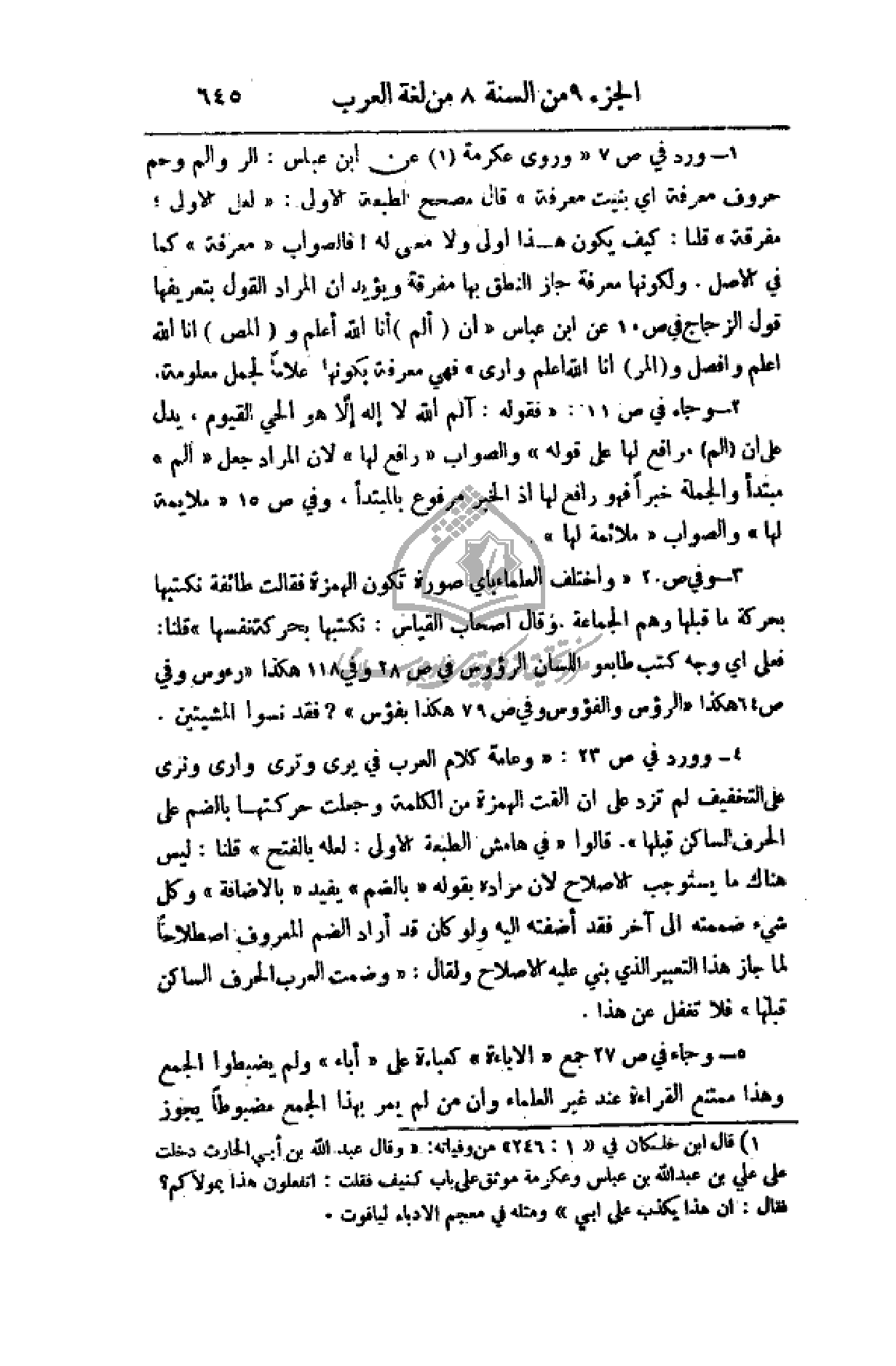 1 - ورد في ص 7 (وروى عكرمة عن ابن عباس: الر والم وحم حروف معرفة أي بنيت معرفة) قال مصحح الطبعة الأولى: (لعل الأولى، مفرقة) قلنا: كيف يكون هذا أولى ولا معنى له! فالصواب (معرفة) كما في الأصل. ولكونها معرفة جاز النطق بها مفرقة ويؤيد أن المراد القول بتعريفها قول الزجاج في ص 10 عن ابن عباس (إن (ألم) أنا الله أعلم (المص) أنا الله اعلم وافصل و (المر) أنا الله اعلم ورأى) فهي معرفة بكونها إعلاماً لجمل معلومة.