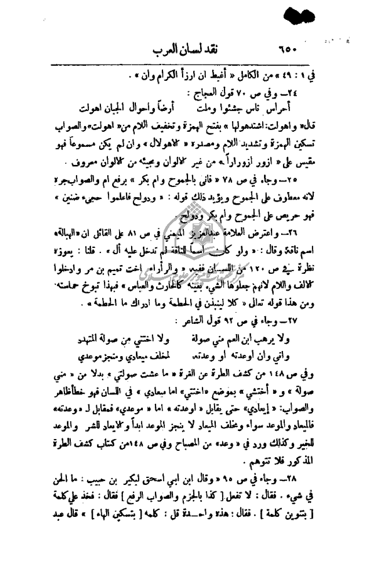 25 - وجاء في ص78 (فأنى بالجموح وأم بكر) برفع أم والصواب جره لأنه معطوف على الجموح ويؤيد ذلك قوله: (ودولح فاعلموا حجئ ضنين) فهو حريص على الجموح وأم بكر ودولح.
