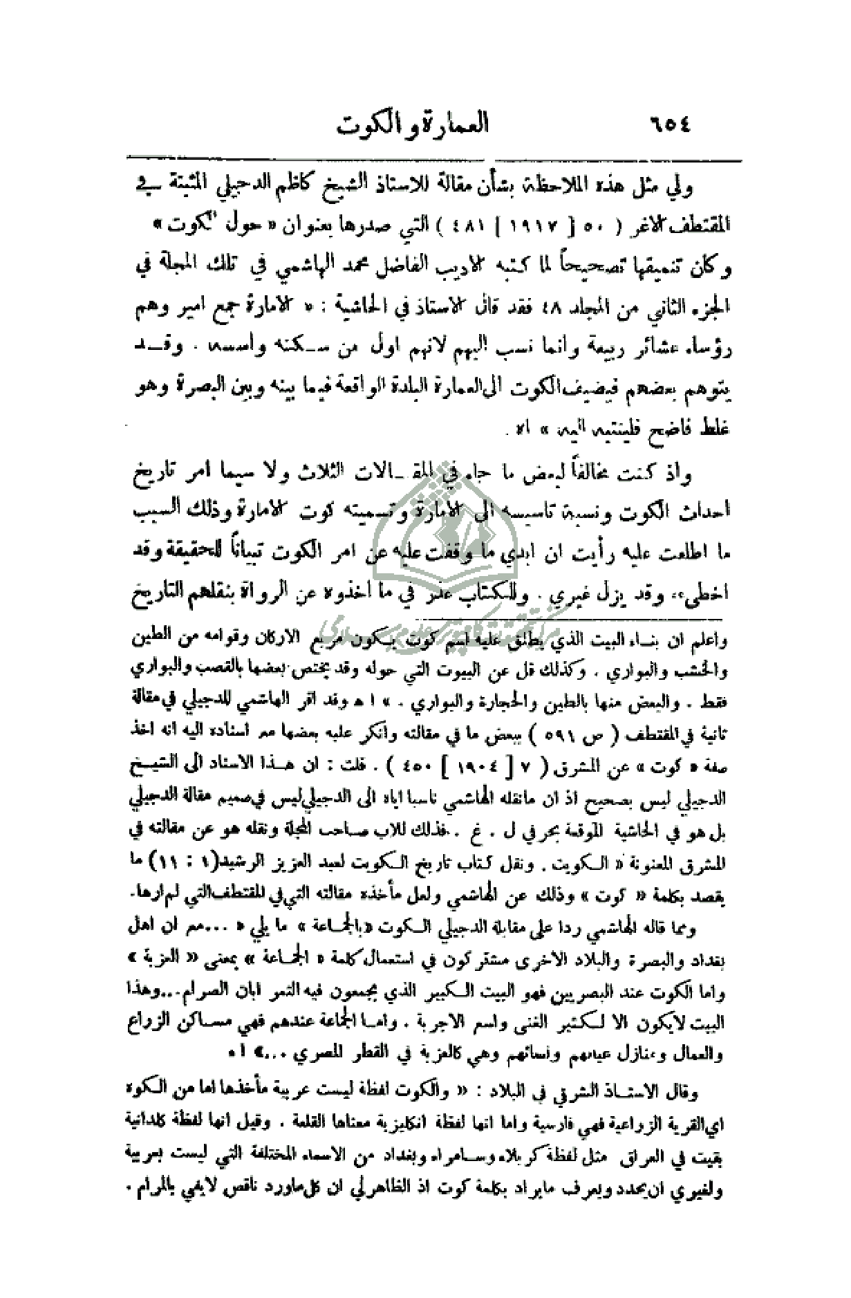 ولي مثل هذه الملاحظة بشأن مقالة الأستاذ الشيخ كاظم الدجيلي المثبتة في المقتطف (50 (1917) 481) التي صدرها بعنوان (حول الكوت) وكان تنميقها تصحيحاً لما كتبه الأديب الفاضل محمد الهاشمي في تلك المجلة في الجزء الثاني من المجلد 48 فقد قال الأستاذ في الحاشية: (الأمارة جميع أمير وهم رؤساء عشائر ربيعة وإنما نسب إليهم لأنهم أول من سكنه وأسسه. وقد يتوهم بعضهم فيضيف الكوت إلى العمارة البلدة الواقعة فيما بينها وبين البصرة وهو غلط فاضح فلينتبه إليه) اهـ.