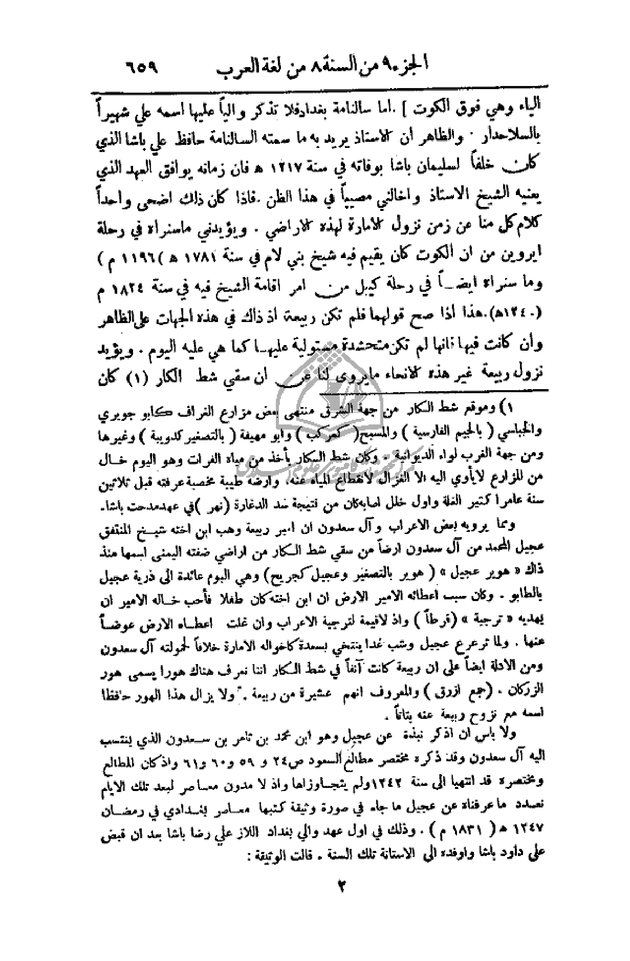 الياء فوق الكوت). أم سالنامة بغداد فلا تذكر والياً عليها اسمه علي شهيراً بالسلاحدار، والظاهر أن الأستاذ يريد به ما سمته السالنامة حافظ علي باشا الذي كان خلفاً لسليمان باشا بوفاته في سنة 1217هـ فان زمانه يوافق العهد الذي يعنيه الشيخ الأستاذ وأخالني مصيباً في هذا الظن. فإذا كان ذلك أضحى واحداً كلام كل منا عن زمن نزول الأمارة لهذه الأراضي. ويؤيدني ما سنراه في رحلة أيروين من أن الكوت كان يقيم فيها شيخ بني لام في سنة 1781م (1196هـ) وما سنراه أيضاً في رحلة كيبل من أمر إقامة الشيخ فيه في سنة 1824م (1240هـ). هذا إذا صح قولهما فلم تكن ربيعة إذ ذاك في هذه الجهات على الظاهر وان كانت فيها فأنها لم تكن متحشدة مسئولية عليها كما هي عليه اليوم. ويؤيد نزول ربيعة غير هذه الأنحاء ما يروى لنا عن أن سقي شط الكار كان