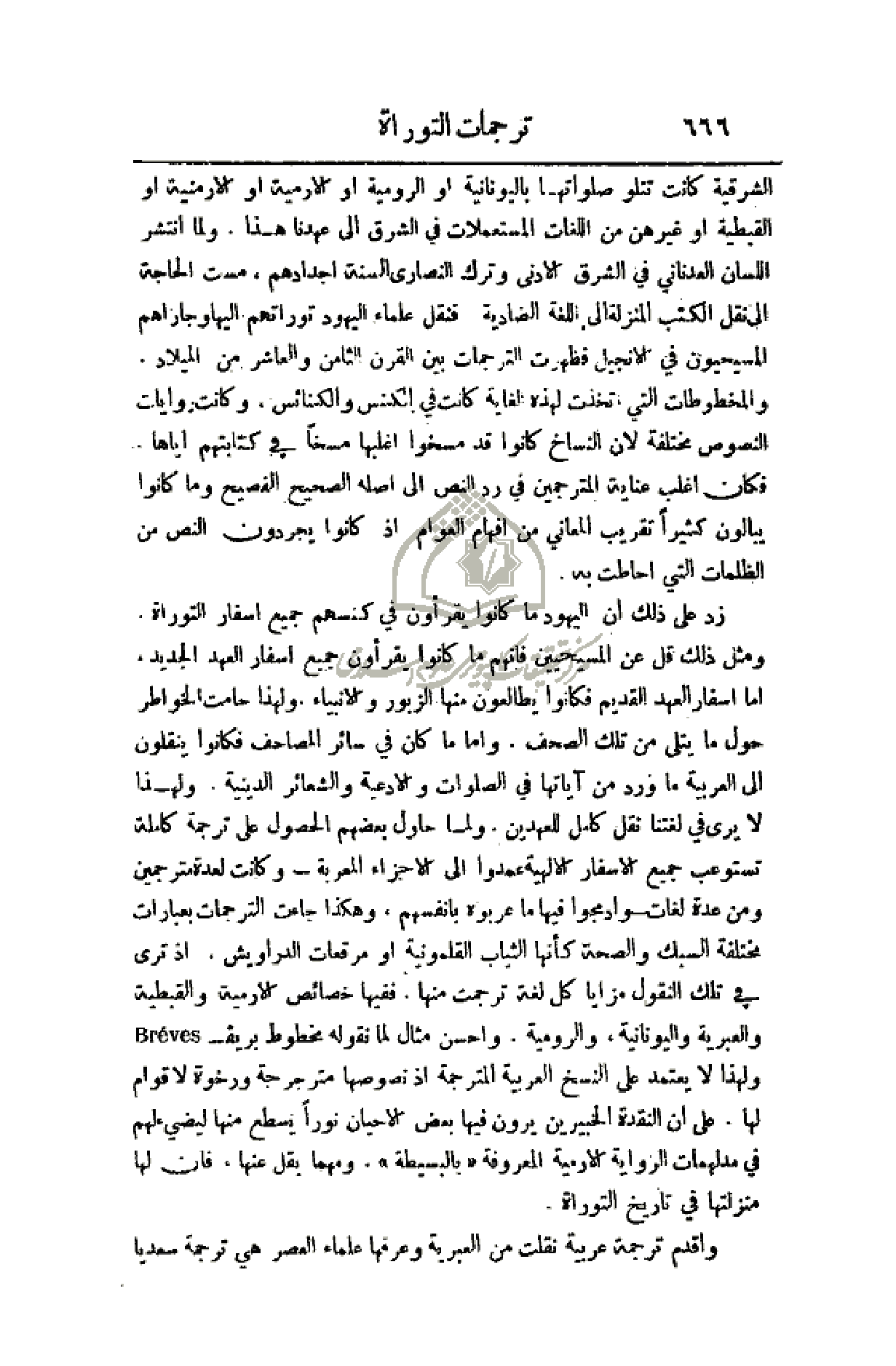زد على ذلك أن اليهود ما كانوا يقرءون في كنسهم جميع أسفار التوراة ومثل ذلك قل عن المسيحيين فانهم ما كانوا يقرءون جميع أسفار العهد الجديد، أما أسفار العهد القديم فكانوا يطالعون منها الزبور والأنبياء، ولهذا حامت الخواطر حول ما يتلى من تلك الصحف، وأما ما كان في سائر المصاحف فكانوا ينقلون إلى العربية ما ورد من آياتها في الصلوات والأدعية والشعائر الدينية. ولهذا لا يرى في لغتنا نقل كامل للعهدين، ولما حاول بعضهم الحصول على ترجمة كاملة تستوعب جميع الأسفار الإلهية عمدوا إلى الأجزاء المعربة - وكانت لعدة مترجمين ومن عدة لغات - وادمجوا فيها ما عربوه بأنفسهم، وهكذا جاءت الترجمات بعبارات مختلفة السبك والصحة كأنها الثياب القلمونية أو مرقعات الدراويش، إذ ترى في تلك النقول مزايا كل لغة ترجمت منها. ففيها خصائص الارمية والقبطية والعبرية واليونانية والرومية. واحسن مثال لما نقوله مخطوط بريف ولهذا لا يعتمد على النسخ العربية المترجمة إذ نصوصها مترجرجة ورخوة لا قوام لها. على أن النقدة الخبيرين يرون فيها بعض الأحيان نوراً يسطع منها ليضيء لهم في مدلهمات الرواية الارمية المعروفة (بالبسيطة). ومهما يقل عنها، فان لها منزلتها في تاريخ التوراة.