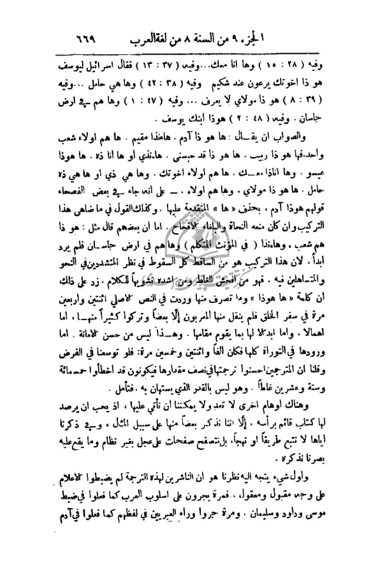 التركيب وان كان منعه النحاة والبلغاء الاقحاح. أما أن بعضهم قال مثل: هو ذا هم شعب. وهاءنذا (في المؤنث المتكلم) وهاهم في أرض جلسان فلم يرد أبداً. لان هذا التركيب هو من الساقط كل السقوط في نظر المتشددين في النحو والمتساهلين فيه. فهو من افحش الغلط ومن اشده تشويهاً للكلام. زد على ذلك أن كلمة (ها هوذا) وما تصرف منها وردت في النص الأصلي اثنتين وأربعين مرة في سفر الخلق فلم ينقل منها المعربون إلا بعضاً وتركوا كثيراً منها، أما إهمالا، وأما إبدالا لها بما يقوم مقامها. وهذا ليس من حسن الأمانة. أما ورودها في التوراة كلها فكان ألفاً واثنتين وخمسين مرة: فلو توسعنا في الفرض وقلنا أن المترجمين احسنوا ترجمتها في نصف مقدارها فيكونون قد اخطئوا خمسمائة وستة وعشرين غلطاً. وهو ليس بالقدر الذي يستهان به، فتأمل.