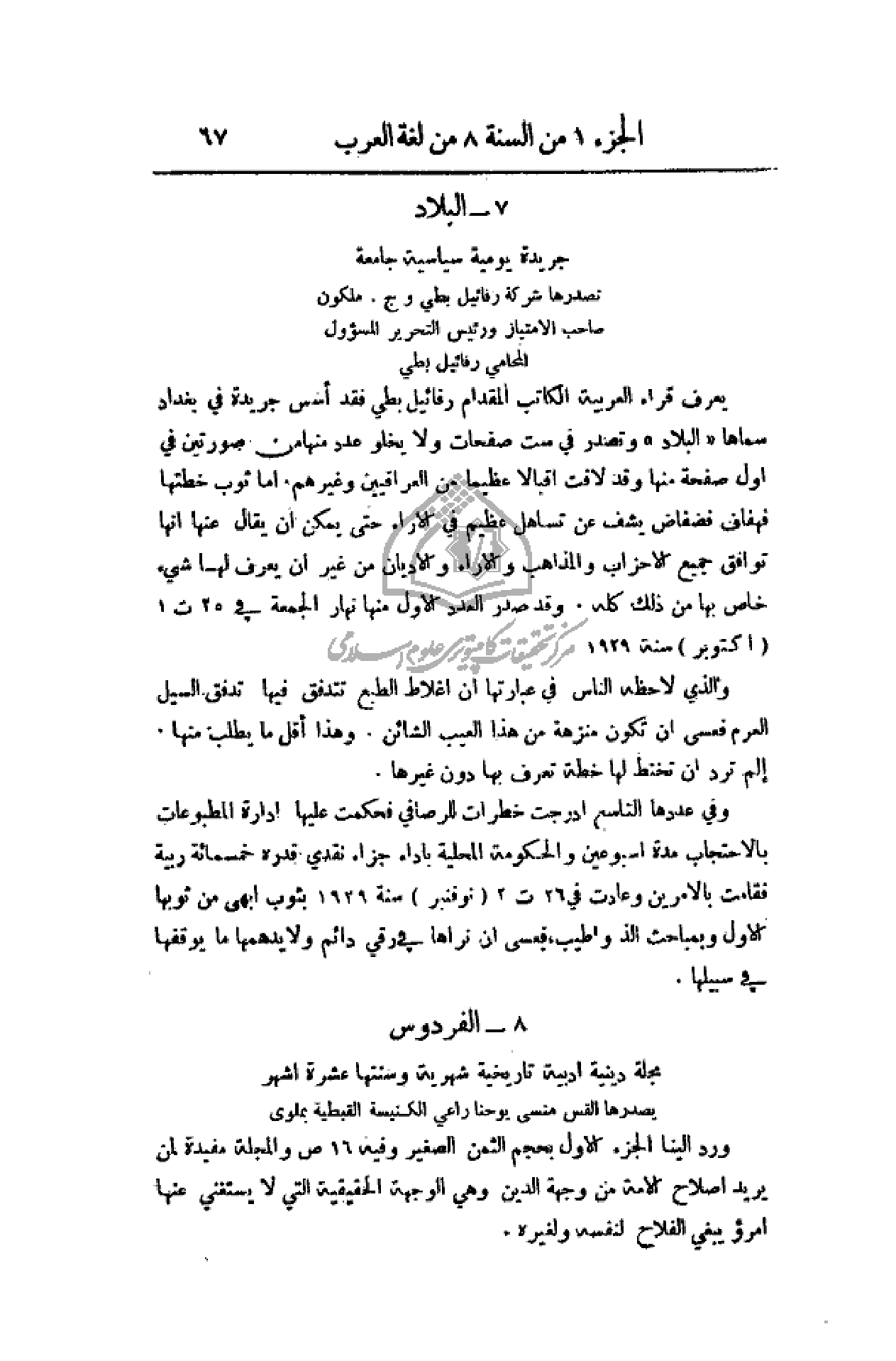 يعرف قراء العربية الكاتب المقدام رفائيل بطي فقد أسس جريدة في بغداد سماها (البلاد) وتصدر في ستة صفحات ولا يخلو عدد منها من صورتين في أو صفحة وقد لاقت إقبالاً عظيماً من العراقيين وغيرهم. أما ثوب خطتها فهفهاف فضفاض يشف عن تساهل عظيم في الآراء حتى يمكن أن يقال عنها أنا توافق جميع الأحزاب والمذاهب والآراء والأديان من غير أن يعرف لها شيء خاص من ذلك كله. وقد صدر العدد الأول منها نهار الجمعة في 25ت1 (1 أكتوبر) سنة 1929.