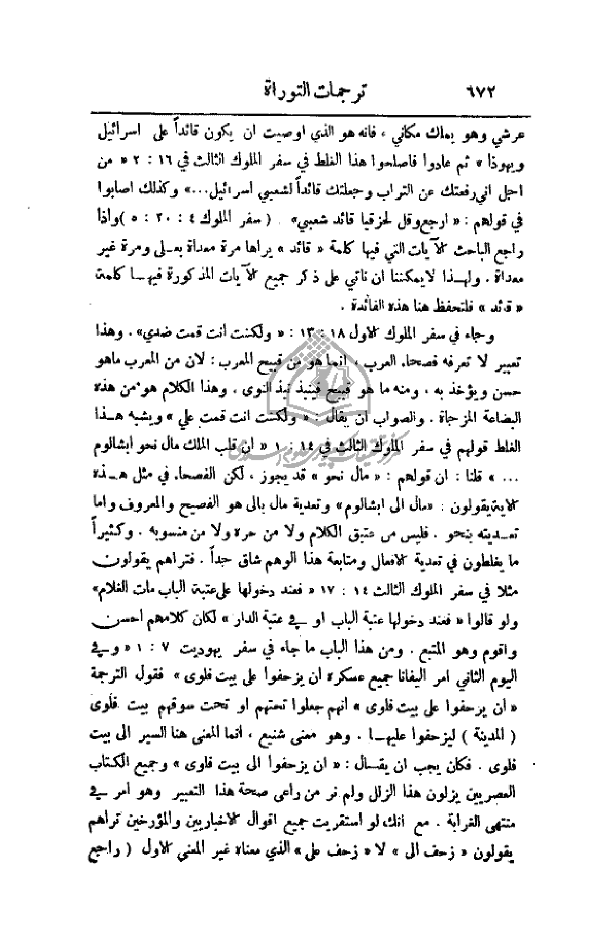 وجاء في سفر الملوك الأول 18: 13: (ولكنت أنت قمت ضدي). وهذا تعبير لا تعرفه فصحاء العرب، إنما هو من قبيح المعرب: لان من المعرب ما هو حسن ويؤخذ به، ومنه ما هو قبيح فينبذ نبذ النوى، وهذا الكلام هو من هذه البضاعة المزجاة. والصواب أن يقال: (ولكنت أنت قمت علي) ويشبه هذا الغلط قولهم في سفر الملوك الثالث في 14: 1 (أن قلب الملك مال نحو ابشالوم. . .) قلنا: أن قولهم: (مال نحو) قد يجوز، لكن الفصحاء في مثل هذه الآية يقولون: (مال ابشالوم) وتعديه مال بالى هو الفصيح والمعروف وأما تعديته بنحو. فليس من عتيق الكلام ولا من حرة ولا من منسوبة. وكثيراً ما يغلطون في تعدية الأفعال ومتابعة هذا الوهم شاق جداً. فتراهم يقولون مثلا في سفر الملوك الثالث 14: 17
