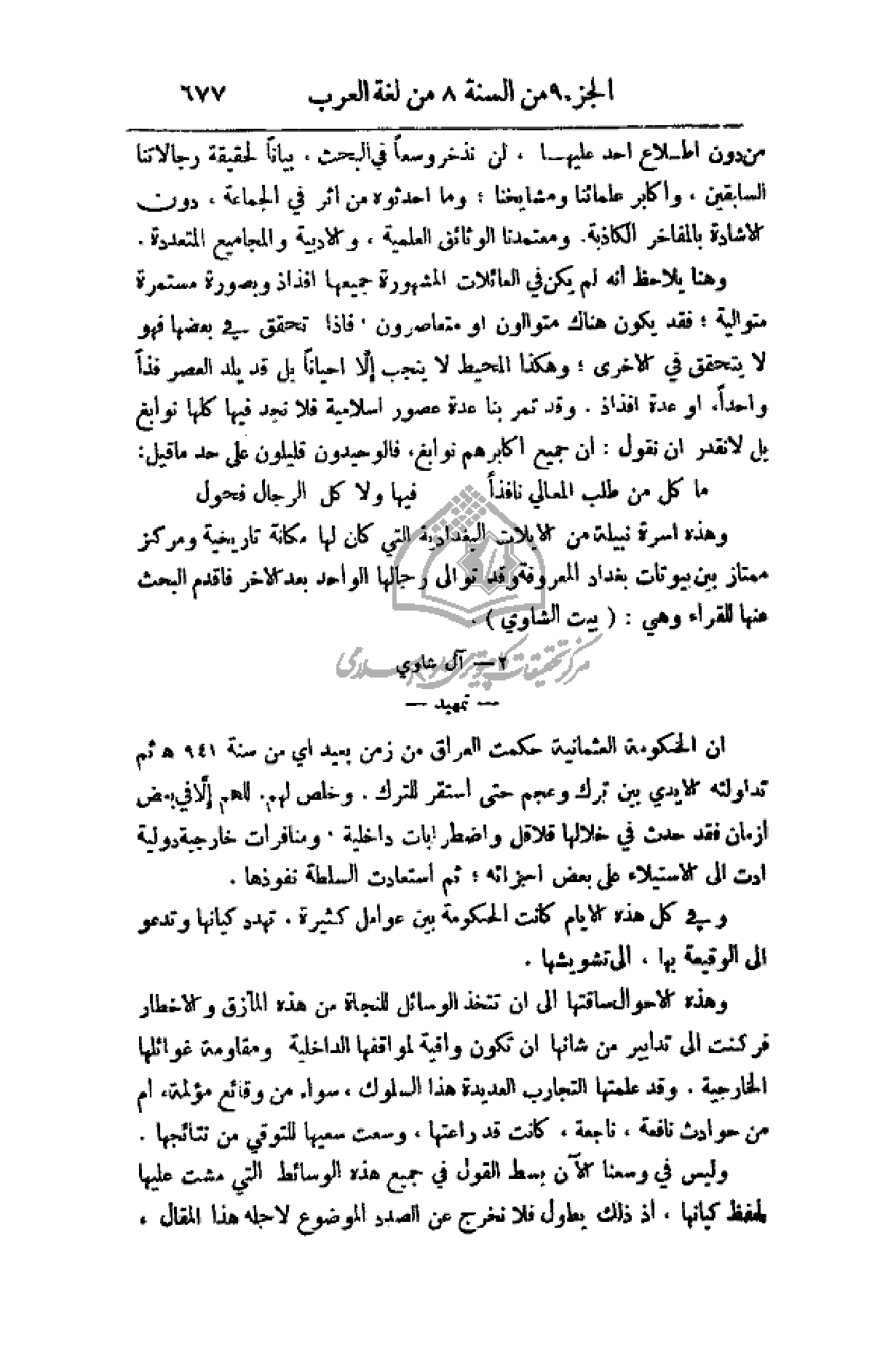 وهذه أسرة نبيلة من الايلات البغدادية التي كان لها مكانة تاريخية ومركز ممتاز بين بيوتات بغداد المعروفة وقد توالى رجالها الواحد بعد الآخر فاقدم البحث عنها للقراء وهي: (بيت الشاوي).