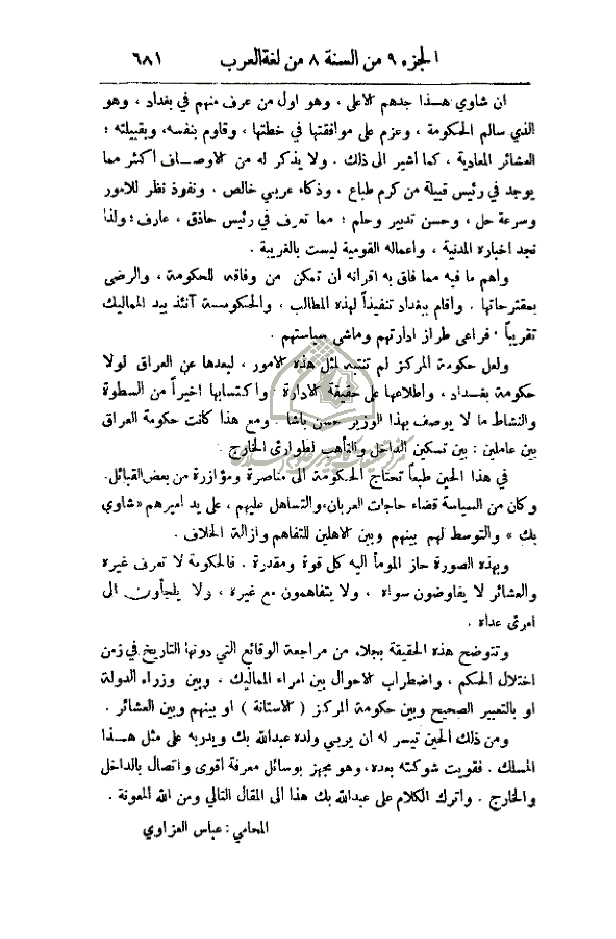 ولعل حكومة المركز لم تنتبه لمثل هذه الأمور، لبعدها عن العراق لولا حكومة بغداد، واطلاعها على حقيقة الإدارة. واكتسابها أخيراً من السطوة والنشاط ما لا يوصف بهذا الوزير حسن باشا. ومع هذا كانت حكومة العراق بين عاملين: بين تسكين الداخل والتأهب لطوارئ الخارج.