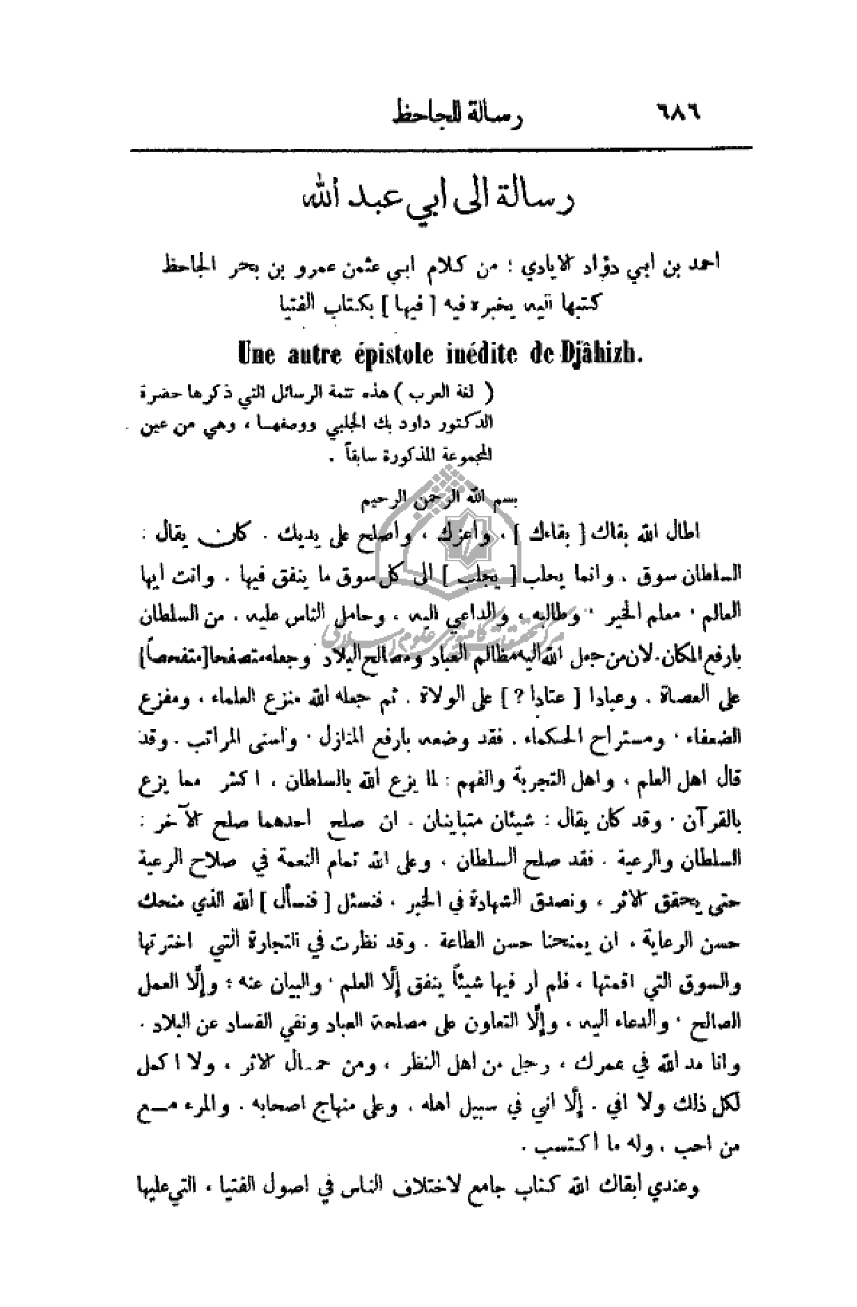 أطال الله بقاك (بقاءك)، واعزك، واصلح على يديك. كان يقال: السلطان سوق، وإنما يجلب (يجلب) إلى كل سوق ما ينفق فيها. وأنت أيها العالم، معلم الخير، وطالبه والداعي إليه، وحامل الناس عليه، من السلطان بأرفع المكان. لان من جعل الله إليه مظالم العباد ومصالح البلاد وجعله متصحفا (متفحصاً) على العصاة. وعباد (عتادا؟) على الولاة. ثم جعله الله منزع العلماء ومفزع الضعفاء، ومستراح الحكماء فقد وضعه بأرفع المنازل، واسني المراتب. وقد قال أهل العلم، وأهل التجربة والفهم: لما يزع الله بالسلطان، اكثر مما يزع بالقرآن. وقد كان يقال شيئان متباينان، أن صلح أحدهما صلح الآخر: السلطان والرعية. فقد صلح السلطان، وعلى الله تمام النعمة في صلاح الرعية حتى يحقق الاثر، ونصدق الشهادة في الخبر، فنسئل (فنسأل) الله الذي منحك حسن الرعاية، أن يمنحنا حسن الطاعة. وقد نظرت في التجارة التي اخترتها والسوق السوق التي أقمتها، فلم أر فيها شيئاً ينفق إلا العلم والبيان عنه، وإلا العمل الصالح، والدعاء إليه، وإلا التعاون على مصلحة العباد ونفي الفساد عن البلاد. وأنا مد الله في عمرك، رجل من أهل النظر، ومن حمال الأثر، ولا اكمل لكل ذلك ولا أفي إلا في سبيل أهله وعلى منهاج أصحابه. والمرء مع من احب، وله ما اكتسب.