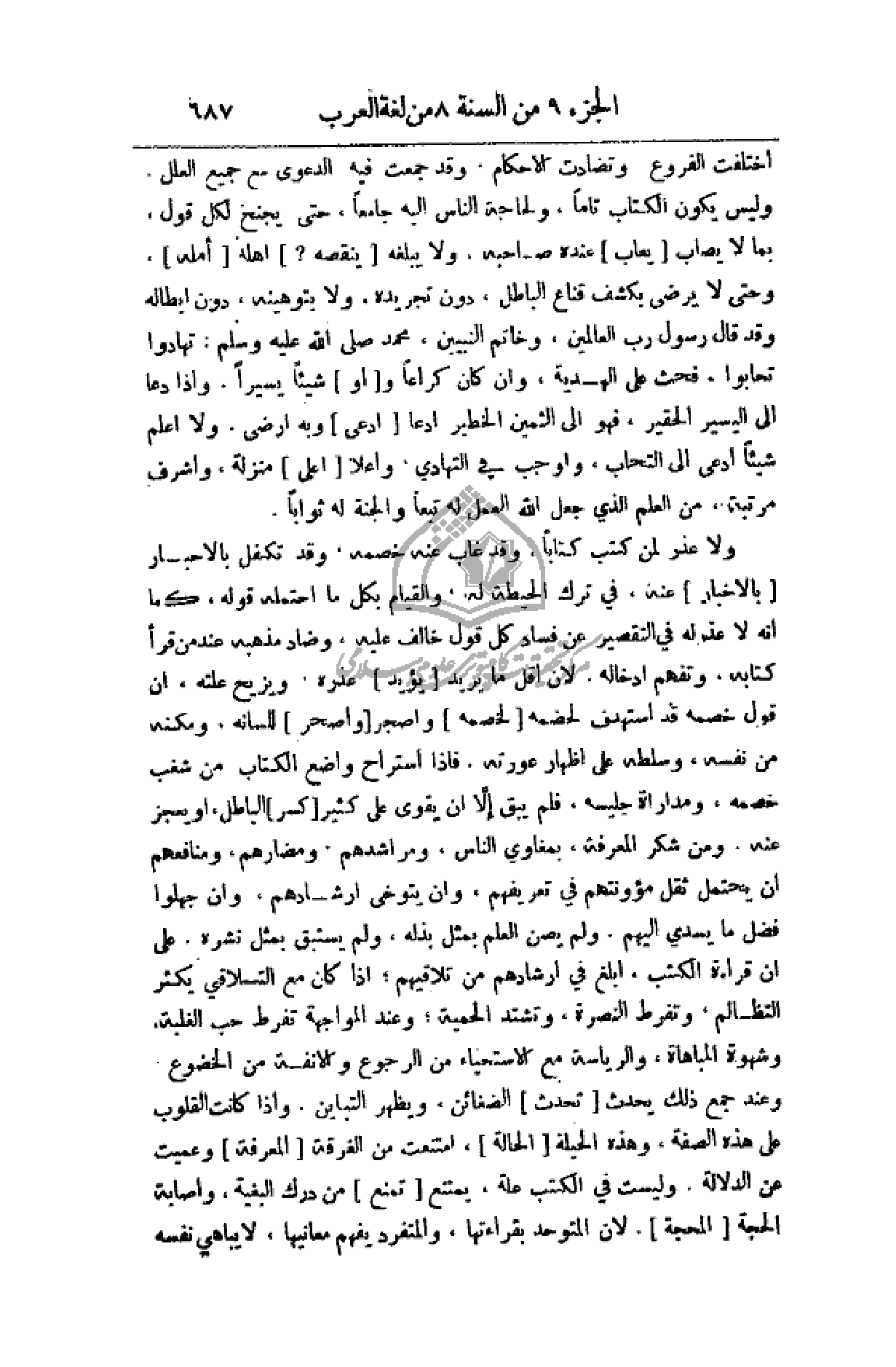 ولا يبلغه (ينقصه) أهله (أمله)، وحتى لا يرضى بكشف قناع الباطل، دون تجريده، ولا بتوهينه، دون أبطاله وقد قال رسول رب العالمين، وخاتم النبيين، محمد صلى الله عليه وسلم: تهادوا تحابوا. فحث على الهدية، وان كان كراعاً و (أو) شيئاً يسيراً. وإذا دعا إلى اليسير الحقير، فهو إلى الثمين الخطير أدعا (ادعى) وبه أرضى. ولا اعلم شيئاً ادعى إلى التجارب، وأوجب في التهادي، وأعلا (أعلى) منزلة، واشرف مرتبة، من العلم الذي جعل الله العمل له تبعاً والجنة له ثواباً.