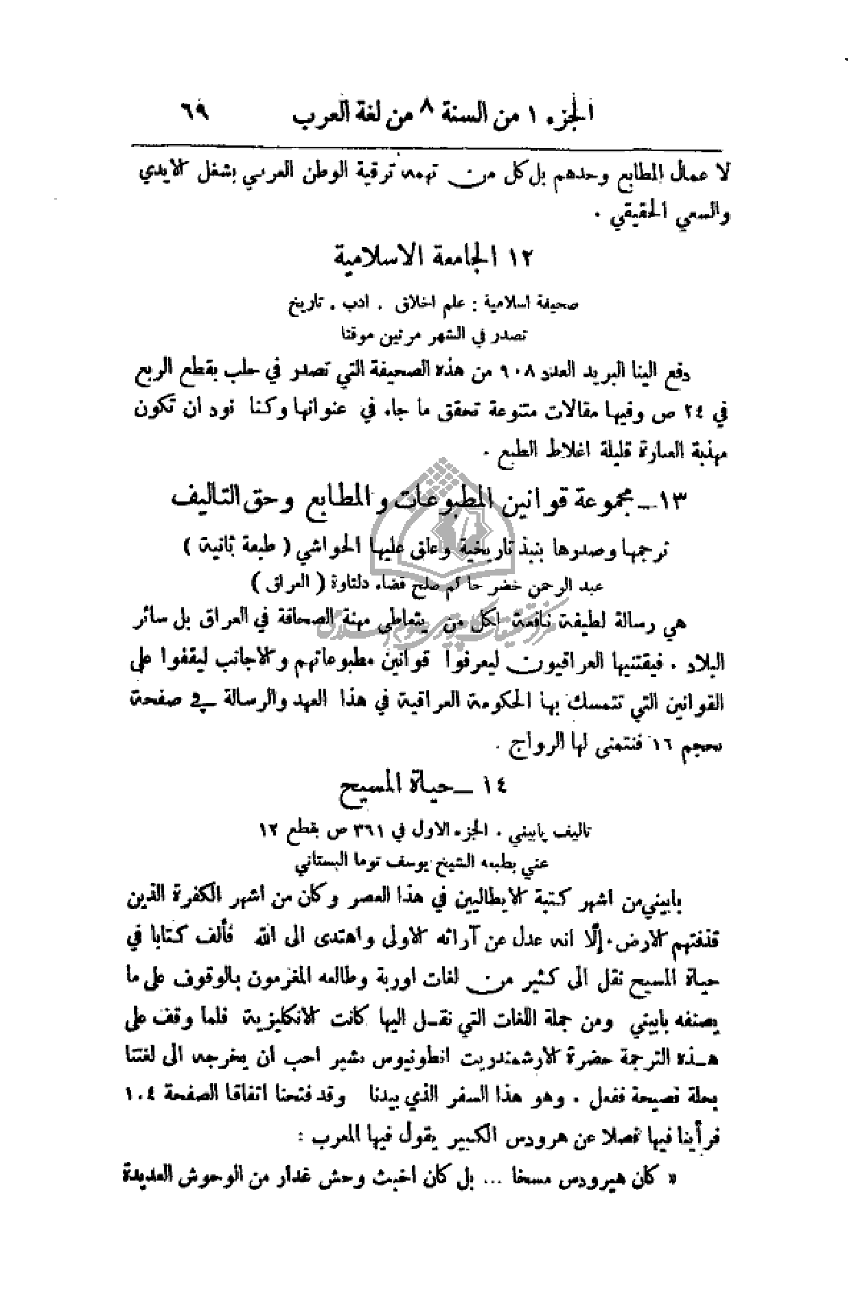 هي رسالة لطيفة نافعة لكل من يتعاطى مهنة الصحافة في العراق بل في سائر البلاد. فيقتنيها العراقيون ليعرفوا قوانين مطبوعاتهم والأجانب ليقفوا على القوانين التي تتمسك بها الحكومة العراقية في هذا العهد والرسالة في صفحة بحجم 16 فنتمنى لها الرواج.