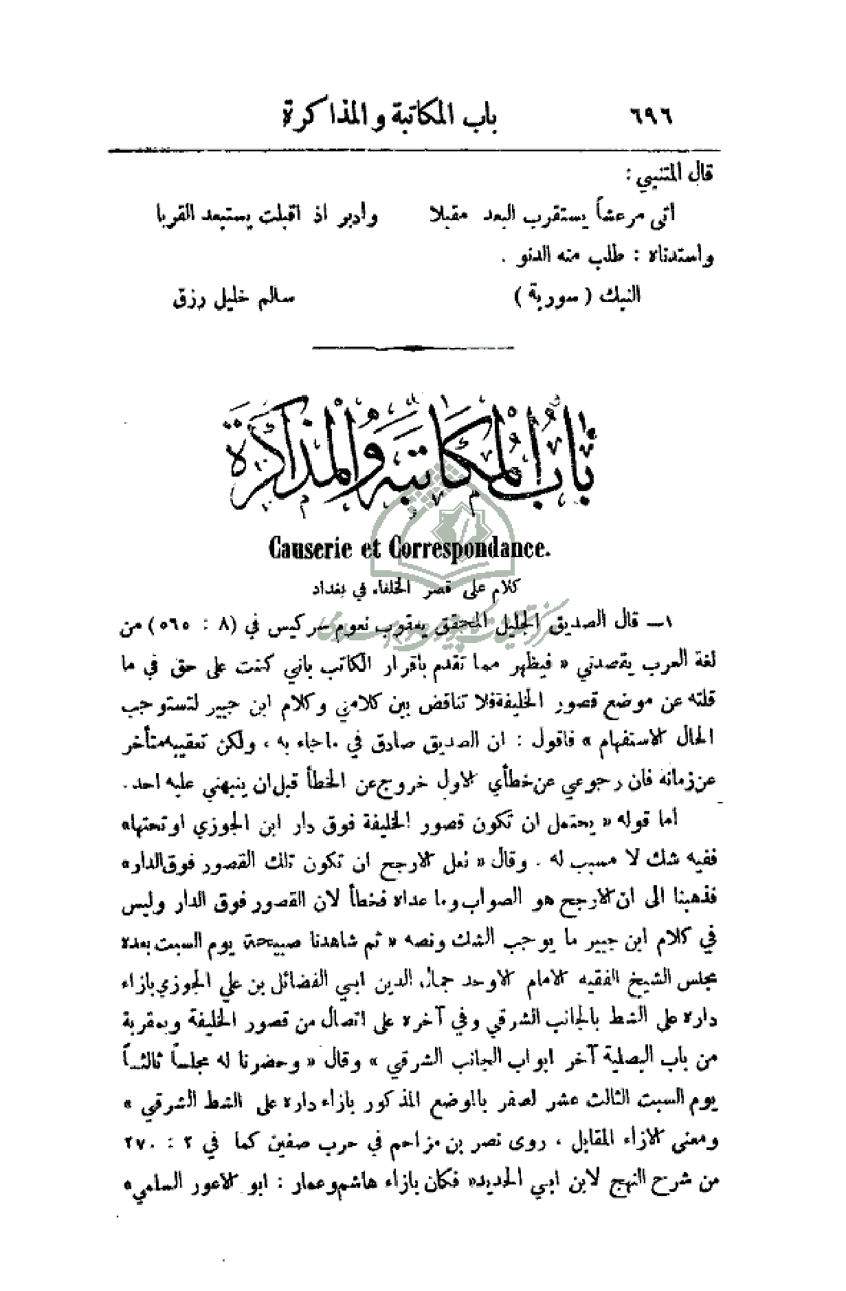 1 - قال الصديق الجليل المحقق يعقوب نعوم سركيس في (565: 8) من لغة العرب يقصدني (فيظهر مما تقدم بإقرار الكاتب بأني كنت على حق في ما قلته عن موضع قصور الخليفة فلا تناقض بين كلامي وكلام ابن جبير لتستوجب الحال الاستفهام) فأقول: أن الصديق صادق في ما جاء به، ولكن تعقيبه متأخر عن زمانه فأن رجوعي عن خطأي الأول خروج عن الخطأ قبل أن ينبهني عليه أحد.