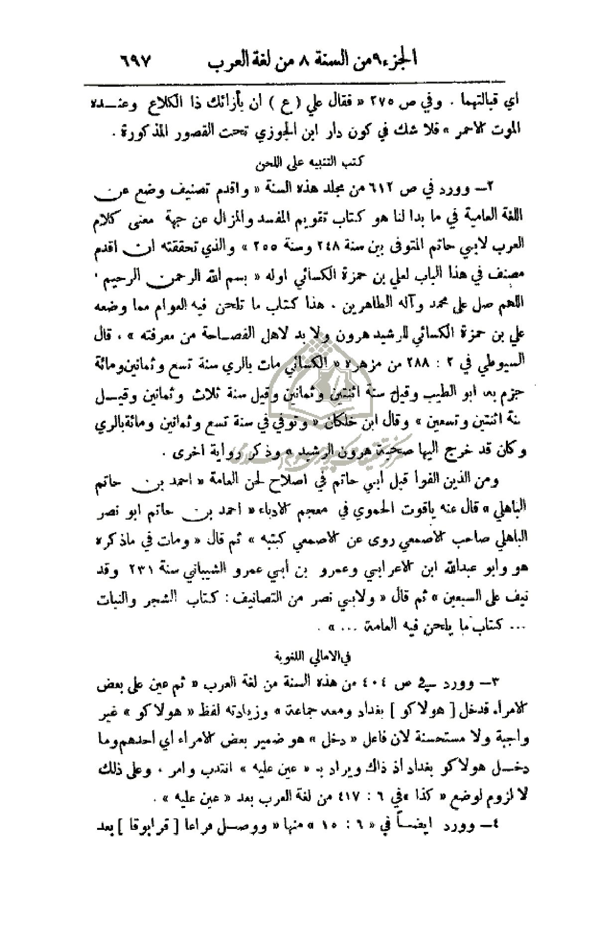 2 - وورد في ص612 من مجلد هذه السنة (وأقدم تصنيف وضع عن اللغة العامية في ما بدا لنا هو كتاب تقويم المفسد والمزال عن جهة معنى كلام العرب لأبي حاتم المتوفي بين سنة 248 وسنة 255) والذي تحققته أن أقدم مصنف في هذا الباب لعلي بن حمزة الكسائي أوله (بسم الله الرحمن الرحيم، اللهم صل على محمد وآله الطاهرين، هذا كتاب ما تلحن