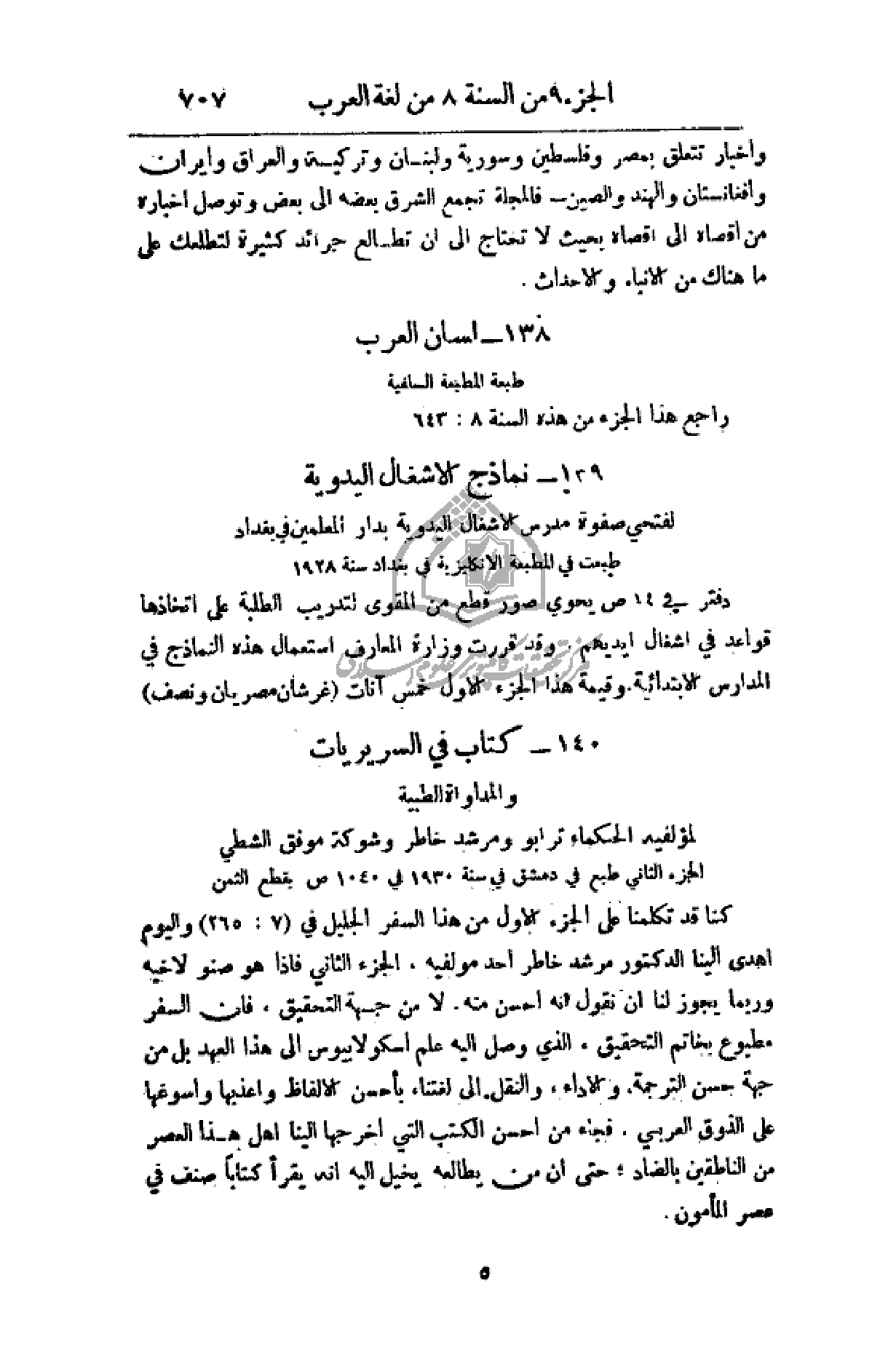 كنا قد تكلمنا على الجزء الأول من هذا السفر الجليل في (265: 7) واليوم أهدى إلينا الدكتور مرشد خاطر أحد مؤلفيه،، الجزء الثاني فإذا هو صنو لأخيه وربما يجوز لنا أن نقول أنه أحسن منه. لا من جهة التحقيق، فأن السفر مطبوع بخاتم التحقيق، الذي وصل إليه علم اسكولابيوس إلى هذا العهد بل من جهة حسن الترجمة. والأداء، والنقل إلى لغتنا بأحسن الألفاظ وأعذبها وأسوغها على الذوق العربي. فجاء من أحسن الكتب التي أخرجها إلينا أهل هذا العصر من الناطقين بالضاد، حتى أن من يطالعه يخيل إليه أنه يقرأ كتاباً صنف في عصر المأمون.