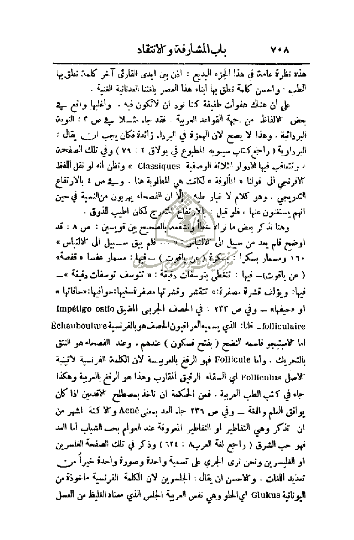 وهنا نذكر بعض ما نراه خطأ ونشفعه بالصحيح بين قويسين: ص8: قد أوضح فلم يعد من سبيل إلى الالتباس: (فلم يبق سبيل إلى الالتباس) 160 ومسمار بسكرا: بسكرة (عن ياقوت) - فيها: مسمار عفسا (قفصة) (عن ياقوت) - فيها: تتغطى بتوسفات دقيقة: (تتوسف توسفات دقيقة) - فيها ويؤلف قشرة مصفرة:) تتقشر وقشرتها مصفرة - فيها: حوافيها: (حافاتها) أو (حيفها) - وفي ص233: في الحصف الجربي المضيق - قلنا: الذي يسميه العراقيون الحصف هو بالفرنسية أما الابتيجو فاسمه النضح (بفتح فسكون) عندهم. وعند الفصحاء هو النتق بالتحريك، وأما فهو الرفغ بالعربية لأن الكلمة الفرنسية لاتينية في الأصل أي السقاء الرقيق المقارب وهذا هو الرفغ بالعربية وهكذا جاء في كتب الطب العربية. فمن الحكمة أن نأخذ بمصطلح الأقدمين إذا كان يوافق العلم واللغة - وفي ص236 جاء العد بمعنى والاكنة أشهر من أن تذكر وهي التفاطير أو النفاطير المعروفة عند العوام بحب الشباب أما العد فهو حب الشرق (راجع لغة العرب 624: 8) وذكر في تلك الصفحة الغلسرين أو الغليسرين ونحن نرى الجري على تسمية واحدة وصورة واحدة خيراً من تعديد اللغات. والأحسن أن يقال: الجلسرين لأن الكلمة الفرنسية مأخوذة من اليونانية أي الحلو وهي نفس العربية الجلس الذي معناه الغليظ من العسل