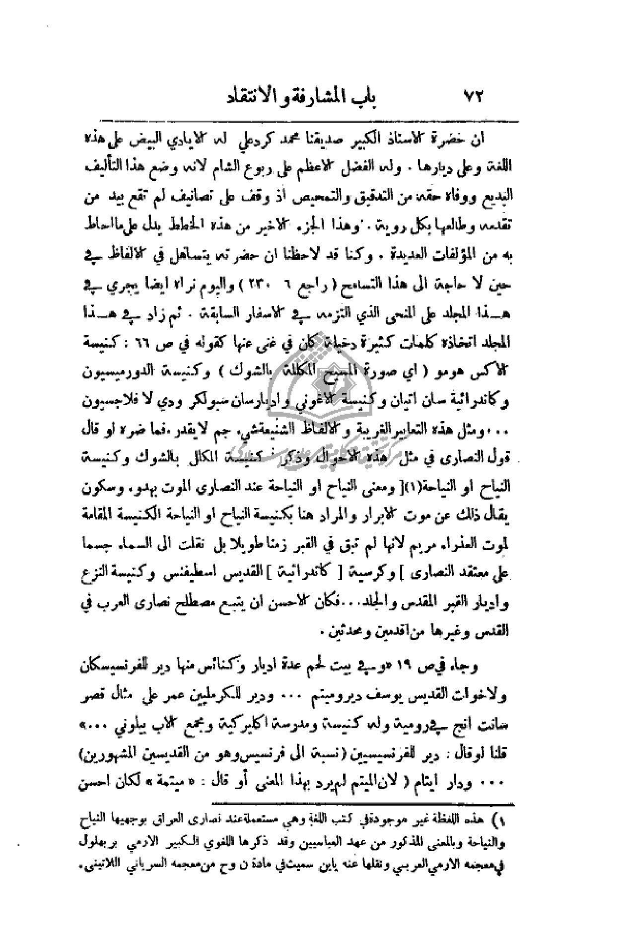أن حضرة الأستاذ الكبير صديقنا محمد كرد علي له الأيادي البيض على هذه اللغة وعلى ديارها. وله الفضل الأعظم على ربوع الشام لأنه وضع هذا التأليف البديع ووفاه حقه من التدقيق والتمحيص إذ وقف على تصانيف لم تقع بيد من تقدمه وطالعها بكل روية. وهذا الجزء الأخير من هذه الخطط يدل على ما أحاط به من المؤلفات العديدة. وكنا قد لاحظنا أن حضرته يتساهل في الألفاظ في حين لا حاجة إلى هذا التسامح (راجع 6: 230) واليوم نراه أيضاً يجري في هذا المجلد على المنحى الذي ألتزمه في الأسفار السابقة. ثم زاد في هذا المجلد اتخاذه كلمات كثيرة دخيلة كان في غنى عنها كقوله في ص66: كنيسة الاكس هومو (أي صورة المسيح المكللة بالشوك) وكنيسة الدورميسيون وكاتدرائية سان اتيان وكنيسة الاغوني واديارسان سبولكر ودي لافجسيون. . . ومثل هذه التعابير الغريبة والألفاظ الشنيعة شيء جم لا يقدر فما ضره لو قال قول النصارى في مثل هذه الأحوال وذكر كنيسة المكلل بالشوك وكنيسة النياح أو النياحة (ومعنى النياح أو النياحة عند النصارى الموت بهدوء وسكون يقال ذلك عند موت الأبرار والمراد هنا بكنيسة النياح أو النياحة الكنيسة المقامة لموت العذراء مريم لأنها لم تبق في القبر زمناً طويلاً بل نقلت إلى السماء جسماً على معتقد النصارى) وكرسية (كاتدرائية) القديس اسطيفنس وكنيسة النزع وأديار القبر المقدس والجلد. . . فكان الأحسن أن يتبع مصطلح نصارى العرب في القدس وغيرها من أقدمين ومحدثين.