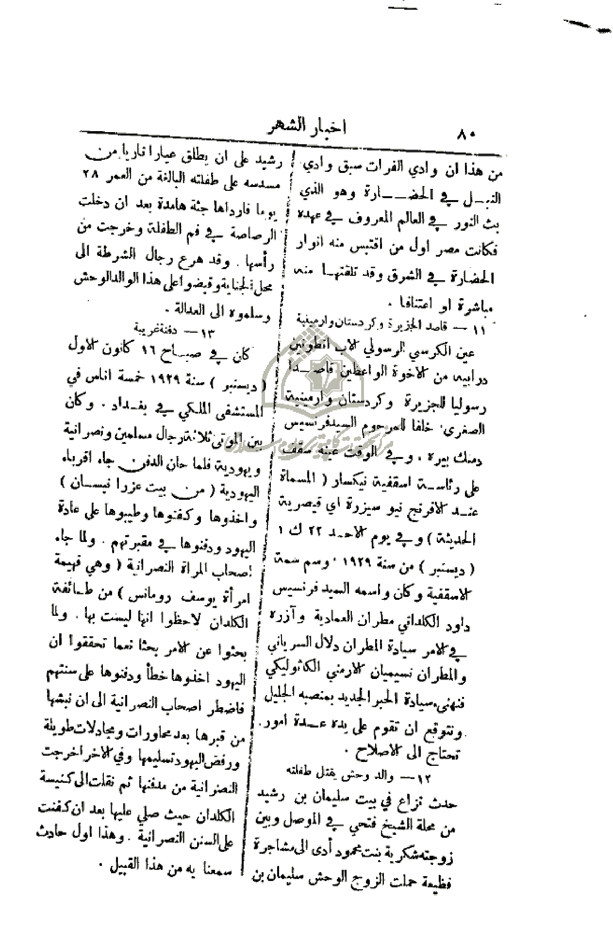 حدث نزاع في بيت سليمان بن رشيد من محلة الشيخ فتحي في الموصل وبين زوجته شكرية بنت محمود أدى إلى مشاجرة فظيعة حملت الزوج الوحش سليمان بن رشيد على أن يطلق عياراً نارياً من مسدسه على طفلته البالغة من العمر 28 يوماً فأرداها جثة هامدة بعد أن دخلت الرصاصة في فم الطفلة وخرجت من رأسها. وقد هرع رجال الشرطة إلى محل الجناية وقبضوا على هذا الوالد الوحش وسلموه إلى العدالة.
