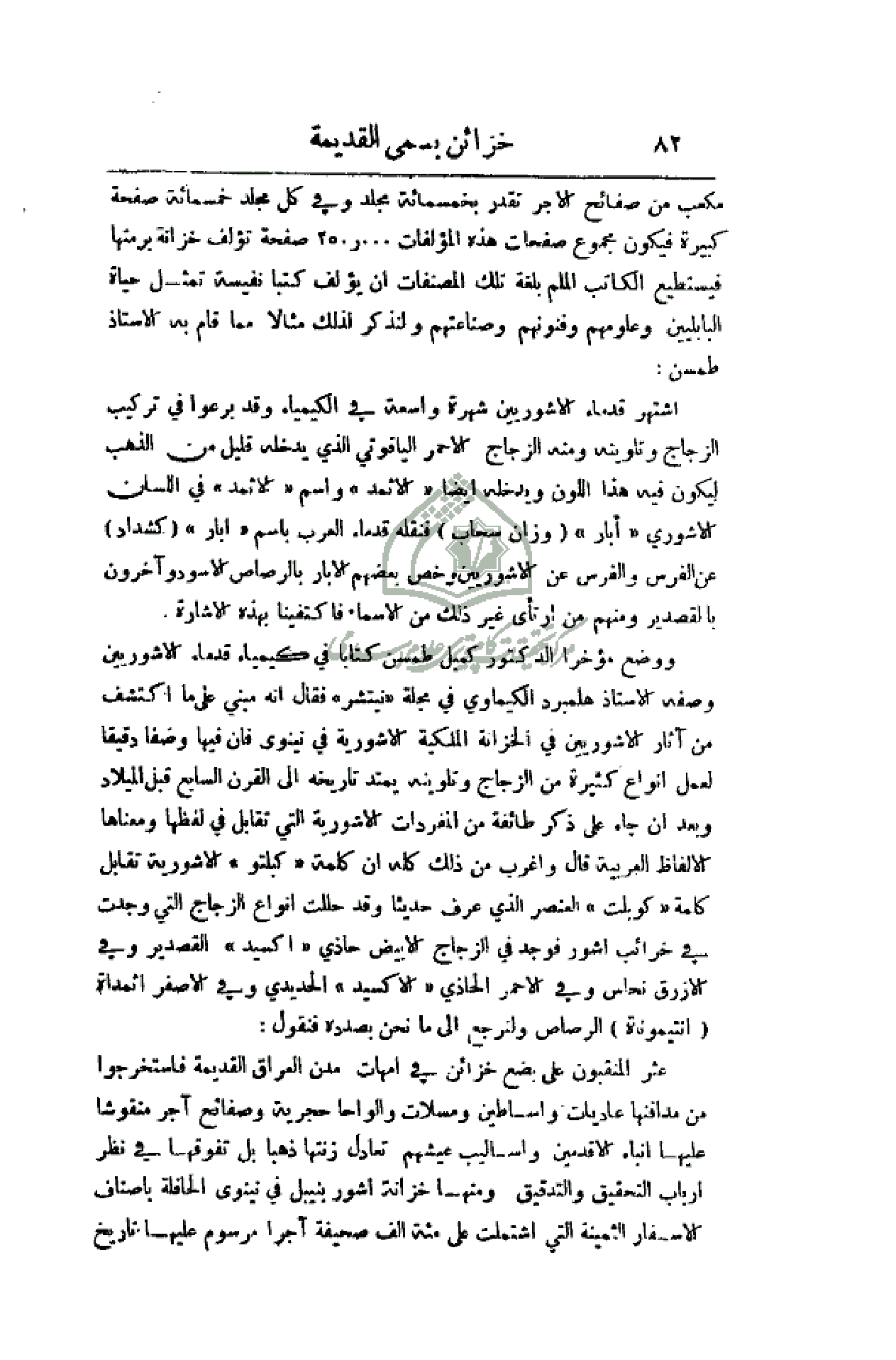 الملكية الآشورية في نينوى فأن فيها وصفاً دقيقاً لعمل أنواع كثيرة من الزجاج وتلوينه يمتد تأريخه إلى القرن السابع قبل الميلاد وبعد أن جاء على ذكر طائفة من المفردات الآشورية التي تقابل في لفظها ومعناها الألفاظ العربية قال واغرب من ذلك كله أن كلمة (كبلتو) الآشورية تقابل كلمة (كوبلت) العنصر الذي عرف حديثاً وقد حللت أنواع الزجاج التي وجدت في خرائب أشور فوجد في الزجاج الأبيض حاذي (أكسيد) القصدير وفي الأزرق نحاس وفي الأحمر الحاذي (الأكسيد) وفي الأصفر أثمداة (انتيموناة) الرصاص ولنرجع إلى ما نحن بصدده فنقول: