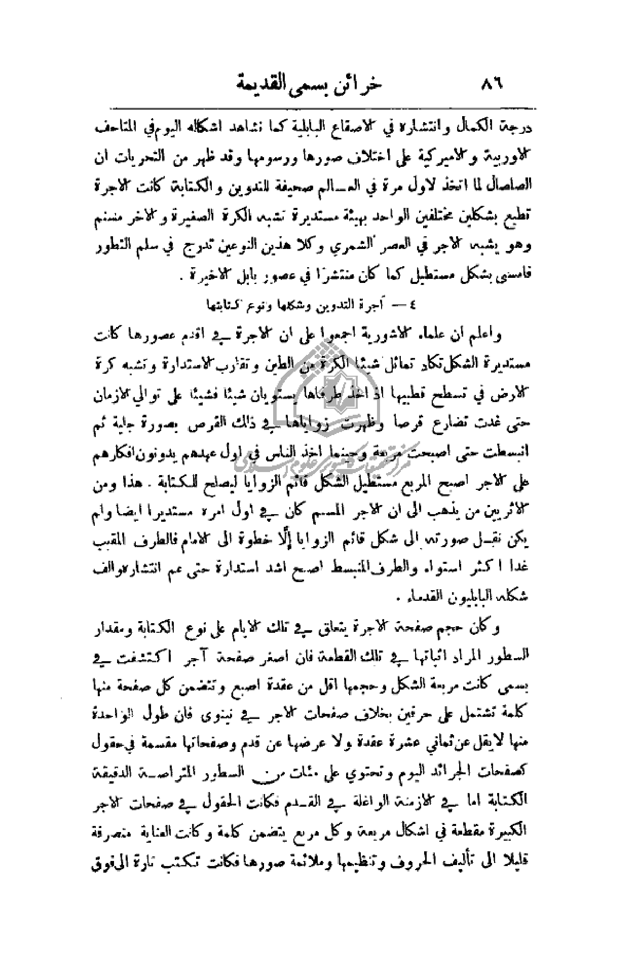 درجة الكمال وانتشاره في الأصقاع البابلية كما نشاهد أشكاله اليوم في المتاحف الأوربية والأميركية على اختلاف صورها ورسومها وقد ظهر من التحريات أن الصلصال لما أتخذ لأول مرة في العالم صحيفة للتدوين والكتابة كانت الأجرة تطبع بشكلين مختلفين الواحد بهيئة مستديرة تشبه الكرة الصغيرة والأخر مسنم وهو يشبه الأجر في العصر الشمري وكلا هذين النوعين تدرج في سلم التطور فأمسى بشكل مستطيل كما كان منتشراً في عصور بابل الأخيرة.