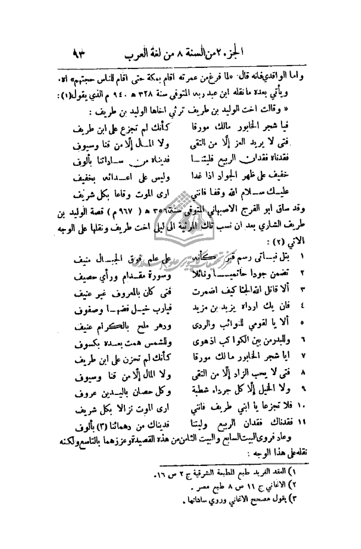 وعاد فروى البيت السابع والبيت الثامن من هذه القصيدة وعززهما بالتاسع ولكنه نقله على هذا الوجه: