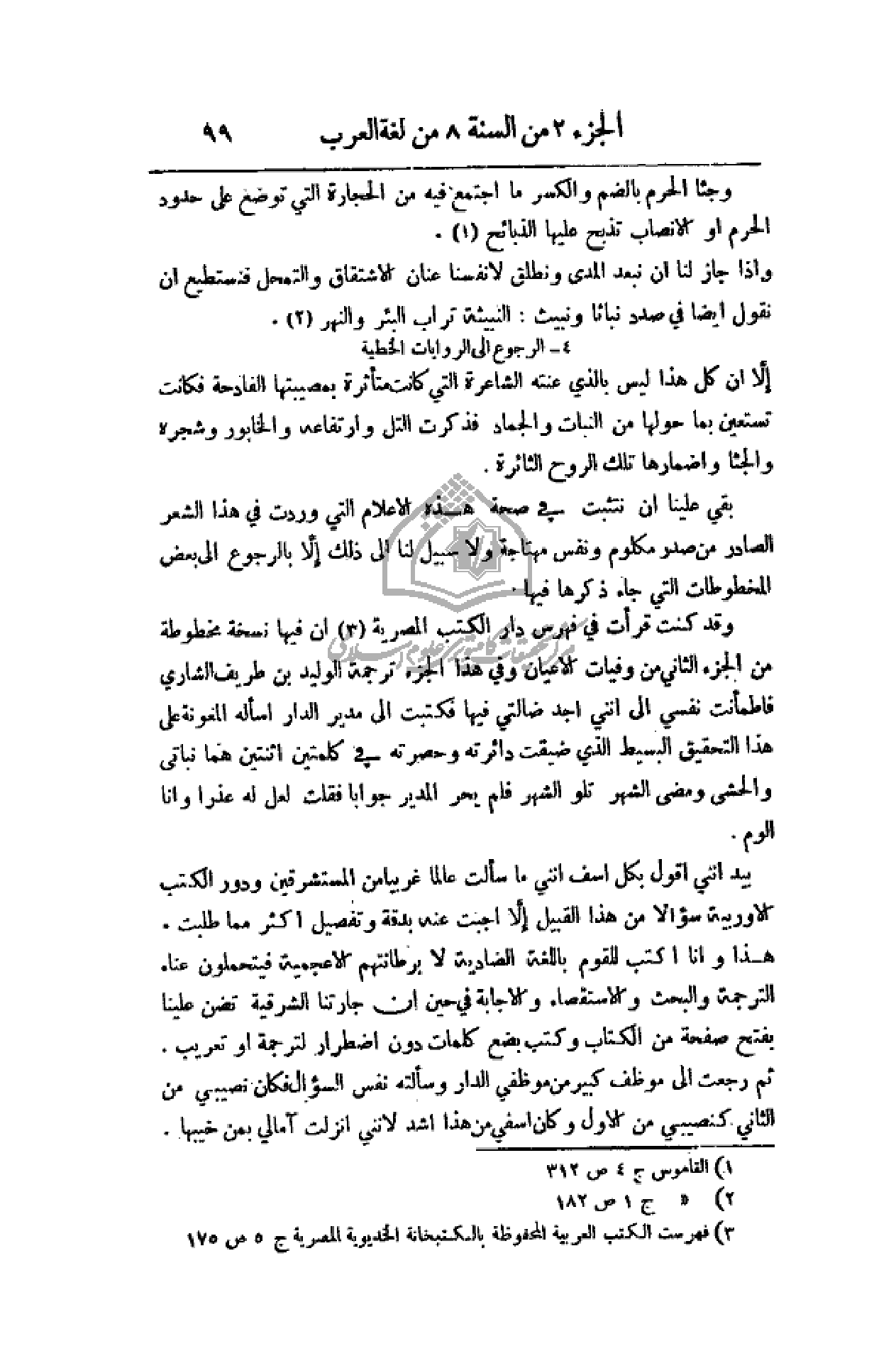وقد كنت قرأت في فهرس دار الكتب المصرية أن فيها نسخة مخطوطة من الجزء الثاني من وفيات الأعيان وفي هذا الجزء ترجمة الوليد بن طريف الشاوي فاطمأنت نفسي إلى أنني أجد ضالتي فيها فكتبت إلى مدير الدار اسأله المعونة على هذا التحقيق البسيط الذي ضيقت دائرته وحصرته في كلمتين اثنتين هما نباتي والحشى ومضى الشهر تلو الشهر فلم يحر المدير جواباً فقلت لعل له عذراً وأنا ألوم.