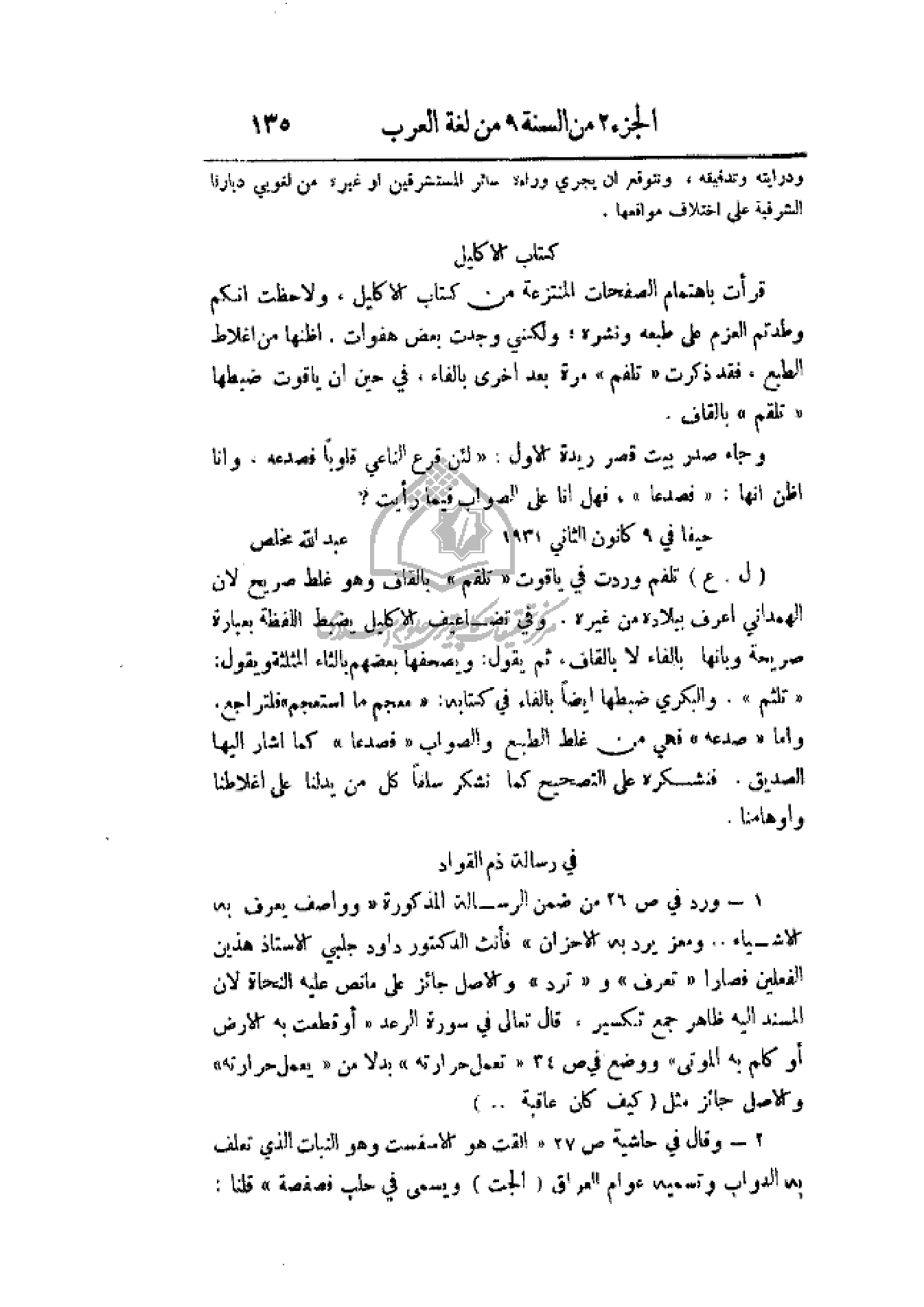 قرأت باهتمام الصفحات المنتزعة من كتاب الإكليل، ولاحظت أنكم وطدتم العزم على طبعه ونشره؛ ولكني وجدت بعض هفوات، أظنها من أغلاط الطبع، فقد ذكرت (تلفم) مرة بعد أخرى بالفاء، في حين أن ياقوت ضبطها (تلقم) بالقاف.