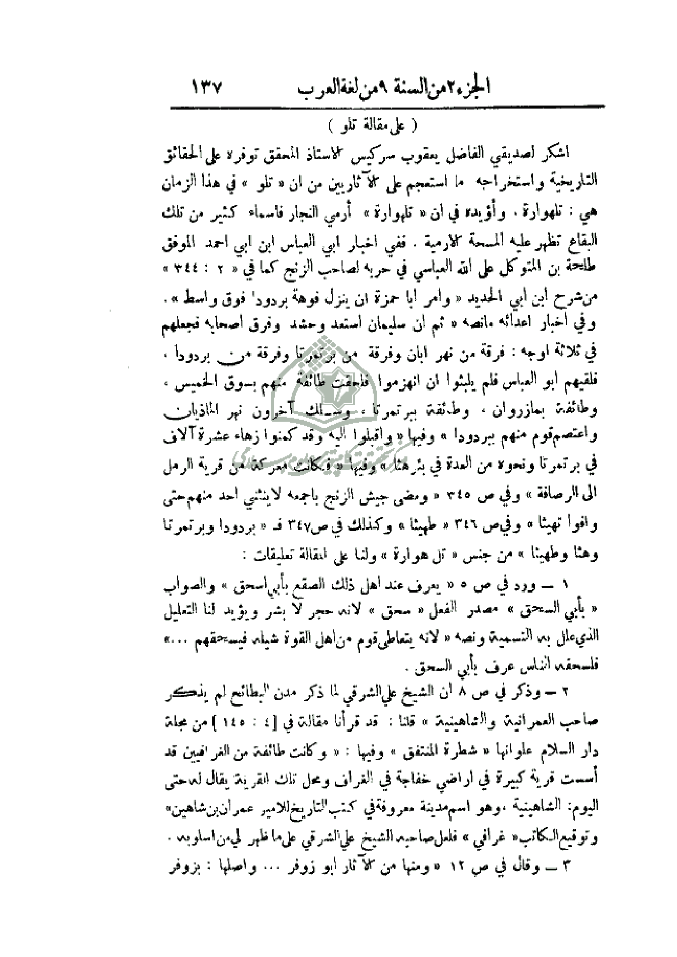 اشكر لصديقي الفاضل يعقوب سركيس الأستاذ المحقق توفره على الحقائق التاريخية واستخراجه ما استعجم على الآثاريين من أن (تلو) في هذا الزمان هي: تلهوارة، وأؤيده في أن (تلهوارة) أرمي النجار فأسماء كثير من تلك البقاع تظهر عليه المسحة الآرمية. ففي أخبار أبي العباس ابن أبي احمد الموفق طلحة بن المتوكل على الله العباسي في حربه لصاحب الزنج كما في (2: 344) من شرح ابن أبي الحديد (وأمر أبا حمزة أن ينزل فوهة