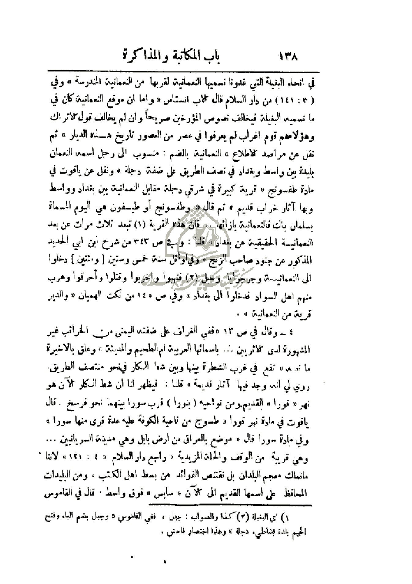 في أنحاء البغيلة التي غدونا نسميها النعمانية لقربها من النعمانية المندرسة) وفي (3: 141) من دار السلام قال الأب انستاس (وأما أن موقع النعمانية كان في ما نسميه البغيلة فيخالف نصوص المؤرخين صريحاً وان لم يخالف قول الأتراك وهؤلاء هم قوم أغراب لم يعرفوا في عصر من العصور تاريخ هذه الديار) ثم نقل عن مراصد الإطلاع) النعمانية بالضم: منسوب إلى رجل اسمه النعمان بليدة بين واسط وبغداد في نصف الطريق على ضفة دجلة) ونقل عن ياقوت في مادة طفسونج (قرية كبيرة في شرقي دجلة مقابل النعمانية بين بغداد وواسط وبها آثار خراب قديم) ثم قال (وطفسونج أو طيسفون هي اليوم المسماة بسلمان باك فالنعمانية