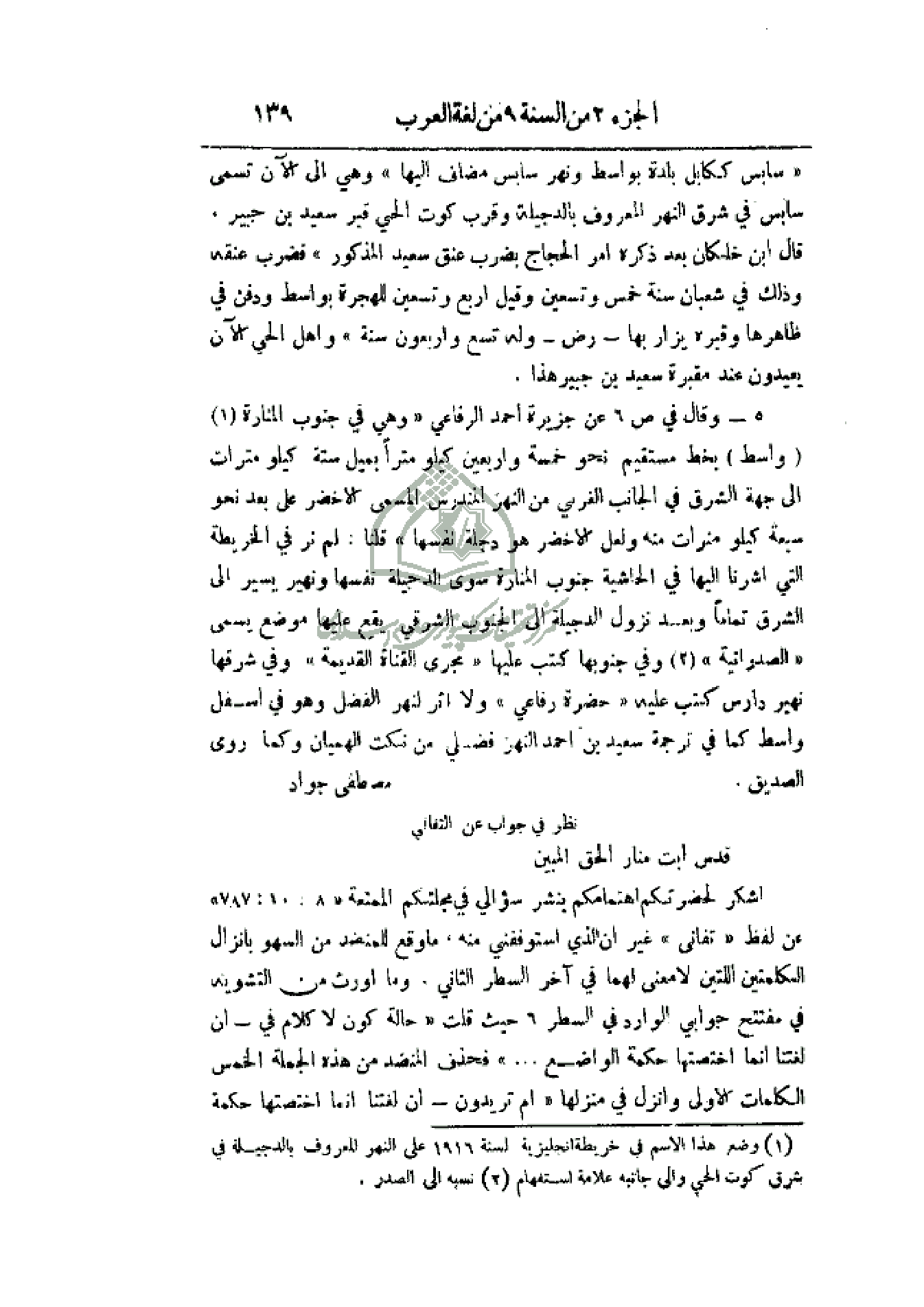 5 - وقال في ص 6 عن جزيرة احمد الرفاعي (وهي في جنوب المنارة (واسط) بخط مستقيم نحو خمسة وأربعين كيلومتراً بميل ستة كيلومترات إلى جهة الشرق في الجانب الغربي من النهر المندرس المسمى الأخضر على بعد نحو سبعة كيلومترات منه ولعل الأخضر هو دجلة نفسها) قلنا: لم نر في الخريطة التي أشرنا إليها في الحاشية جنوب المنارة سوى الدجيلة نفسها ونهير يسير إلى الشرق تماماً وبعد نزول الدجيلة إلى الجنوب الشرقي يقع عليها موضع يسمى (الصدرانية) وفي جنوبها كتب عليها (مجرى القناة