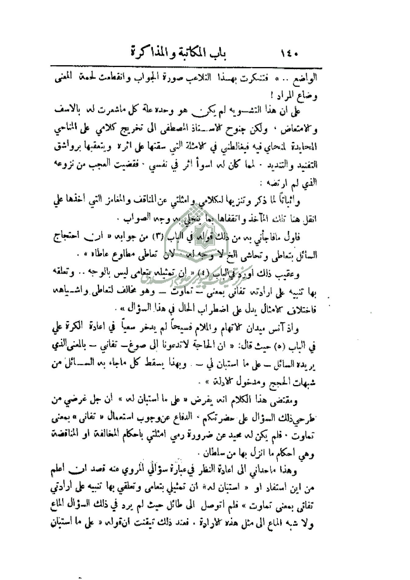 وإذ آنس ميدان الاتهام والملام فسيحاً لم يدخر سعياً في إعادة الكرة علي في الباب (5) حيث قال: (إن الحاجة لا تدعونا إلى صوغ - تفاني - بالمعنى الذي يريده السائل - على ما استبان لي -. وبهذا يسقط كل ما جاء به السائل من شبهات الحجج ومدخول الأدلة).