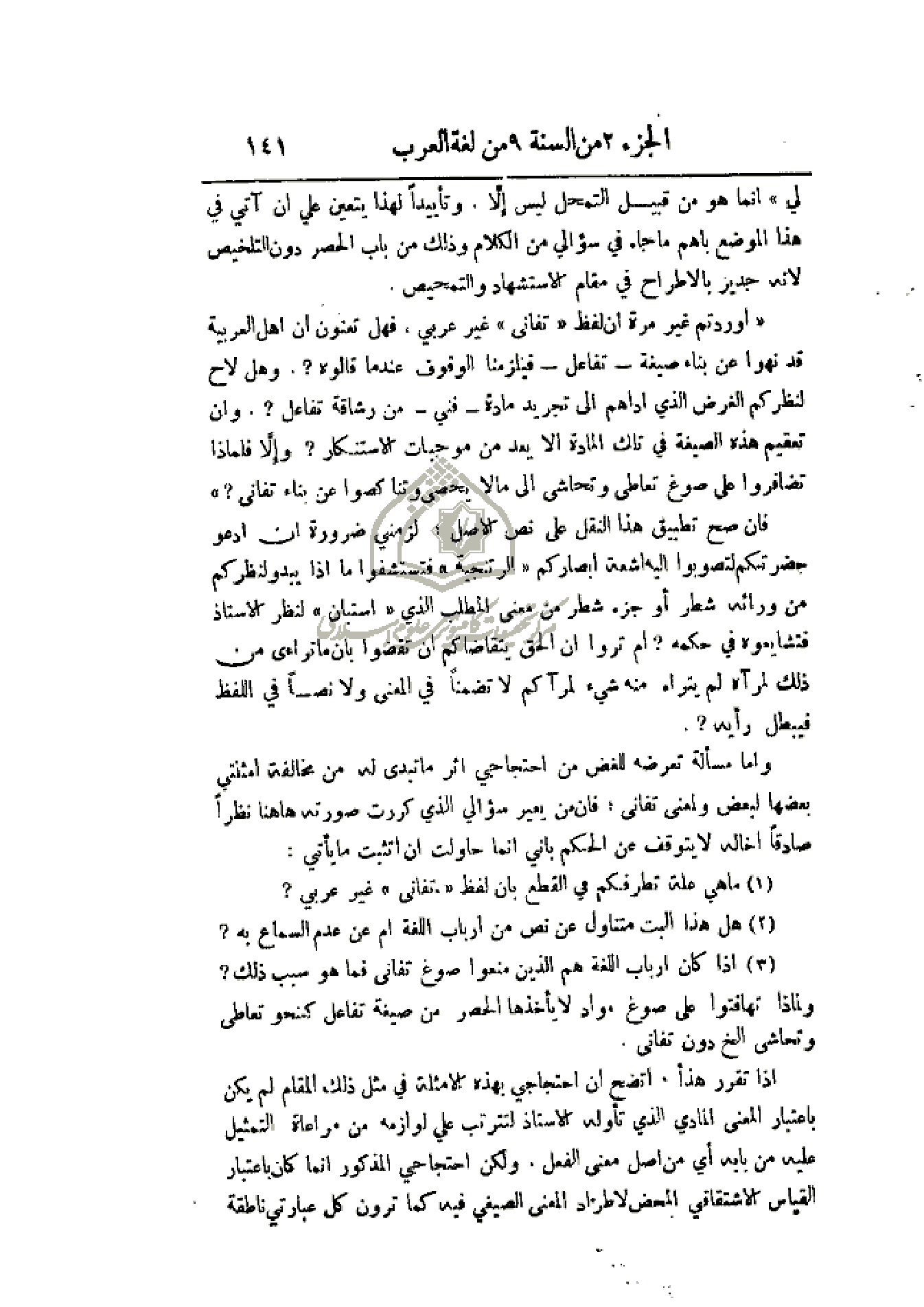 (أوردتم غير مرة أن لفظ (تفاني) غير عربي، فهل تعنون أن أهل العربية قد نهوا بناء صيغة - تفاعل - فيلزمنا الوقوف عندما قالوه؟. وهل لاح لنظركم الغرض الذي أداهم إلى تجريد مادة - فني - من رشاقة تفاعل؟. وان تعقيم هذه الصيغة في تلك المادة إلا يعد من موجبات الإستنكار؟ وإلا فلماذا تضافروا على صوغ تعاطى وتحاشى إلى ما لا يحصى وتناكصوا عن بناء تفاني؟)