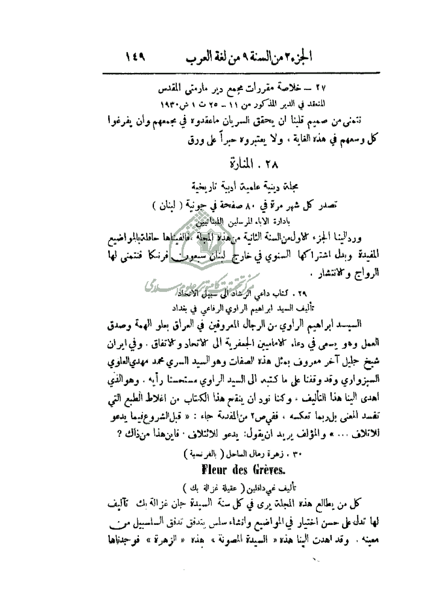 ورد إلينا الجزء الأول من السنة الثانية من هذه المجلة، فألفيناها حافلة بالمواضيع المفيدة وبدل اشتراكها السنوي في خارج لبنان سبعون فرنكا فنتمنى لها الرواج والانتشار.