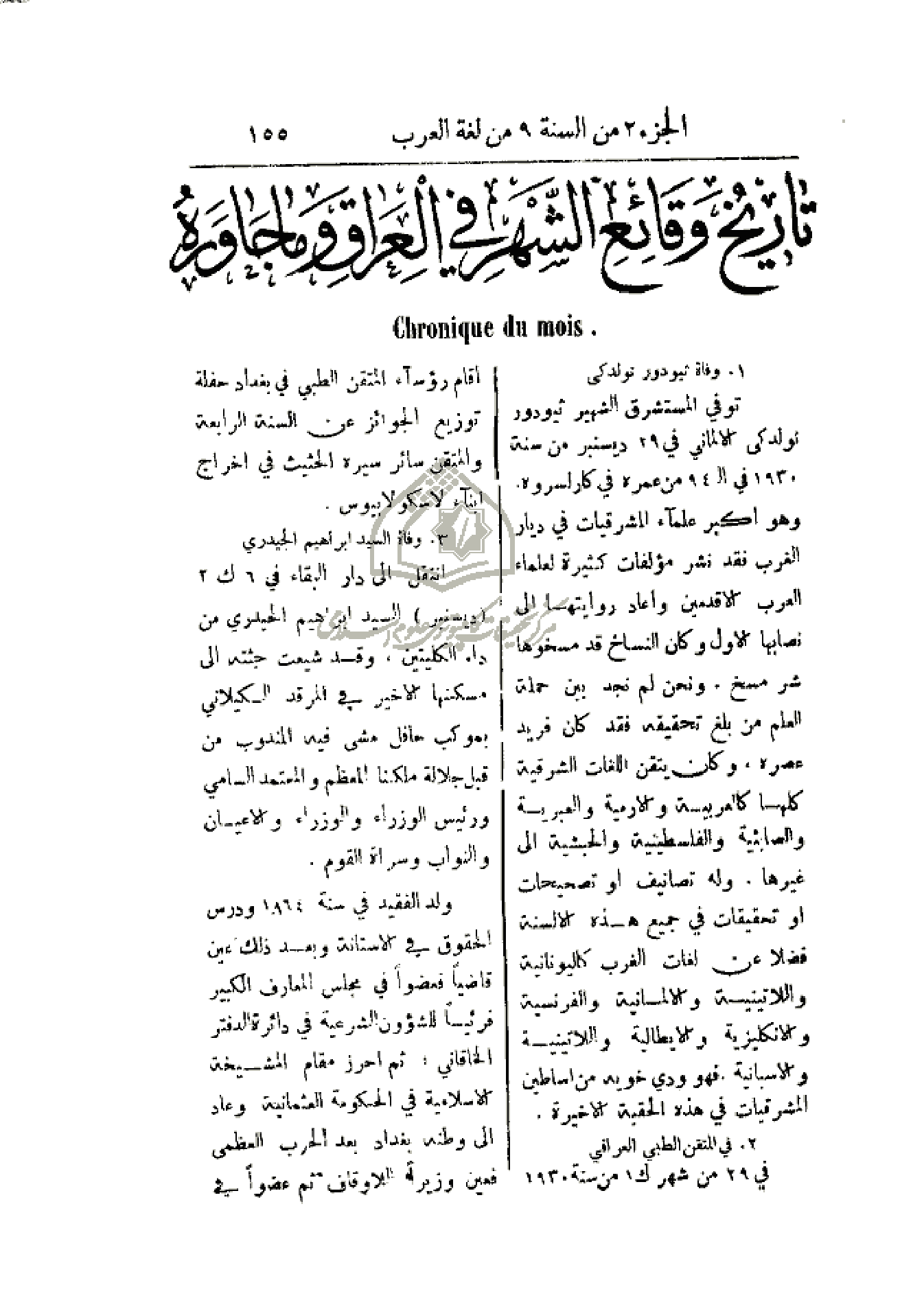 توفي المستشرق الشهير ثيودور نولدكى الألماني في 29 ديسنبر من سنة 1930 في ال 94 من عمره في كارلسروه. وهو اكبر علماء المشرقيات في ديار الغرب فقد نشر مؤلفات كثيرة لعلماء العرب الأقدمين وأعاد روايتها إلى نصابها الأول وكان النساخ قد مسخوها شر مسخ. ونحن لم نجد بين حملة العلم من بلغ تحقيقه فقد كان فريد عصره، وكان يتقن اللغات الشرقية كلها كالعربية والآرمية والعبرية والصابئية والفلسطينية والحبشية إلى غيرها. وله تصانيف أو تصحيحات أو تحقيقات في جميع هذه الألسنة فضلا عن لغات الغرب كاليونانية واللاتينية والألمانية والفرنسية والإنكليزية والإيطالية واللاتينية والإسبانية. فهو ودي خويه من أساطين المشرقيات في هذه الحقبة الأخيرة.