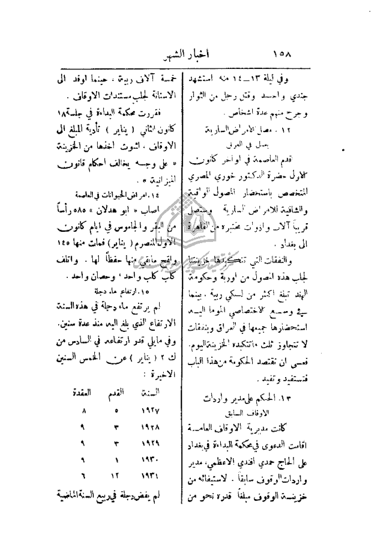 لم يرتفع ماء دجلة في هذه السنة الارتفاع الذي بلغ إليه منذ عدة سنين. وفي ما يلي قدر ارتفاعه في السادس من ك2 (يناير) عن الخمس السنين الأخيرة: