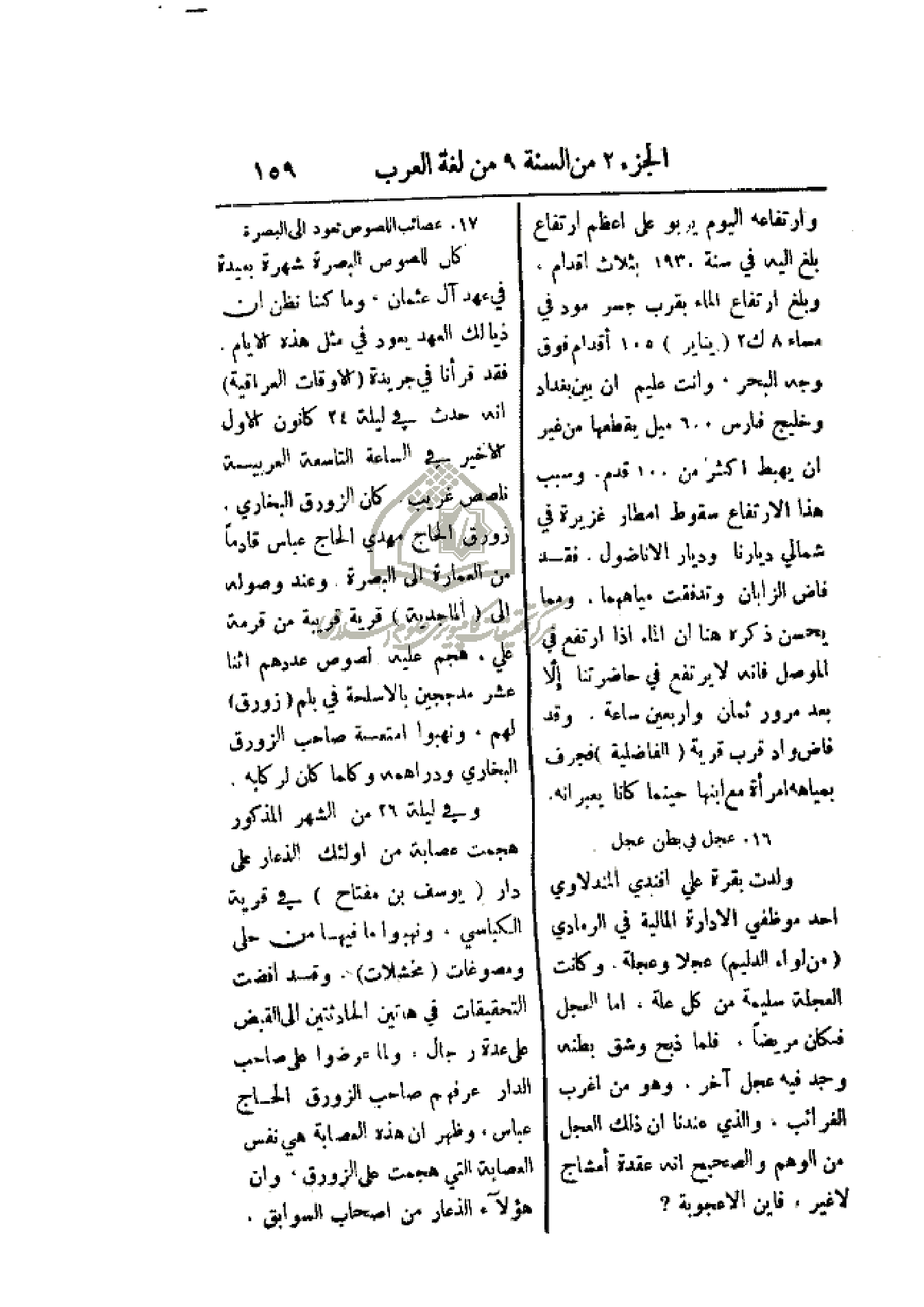 وارتفاعه اليوم يربو على أعظم ارتفاع بلغ إليه في سنة 1930 بثلاث أقدام، وبلغ ارتفاع الماء بقرب جسر مود في مساء 8 ك2 (يناير) 105 أقدام فوق وجه البحر؛ وأنت عليم أن بين بغداد وخليج فارس 600 ميل يقطعها من غير أن يهبط اكثر من 100 قدم. وسبب هذا الارتفاع سقوط أمطار غزيرة في شمالي ديارنا وديار الأناضول. فقد فاض الزابان وتدفقت مياههما، ومما يحسن ذكره هنا أن الماء إذا ارتفع في الموصل فانه لا يرتفع في حاضرتنا إلا بعد مرور ثمان وأربعين ساعة. وقد فاض واد قرب قرية (الفاضلية) فجرف بمياهه امرأة مع ابنها حينما كانا يعبرانه.
