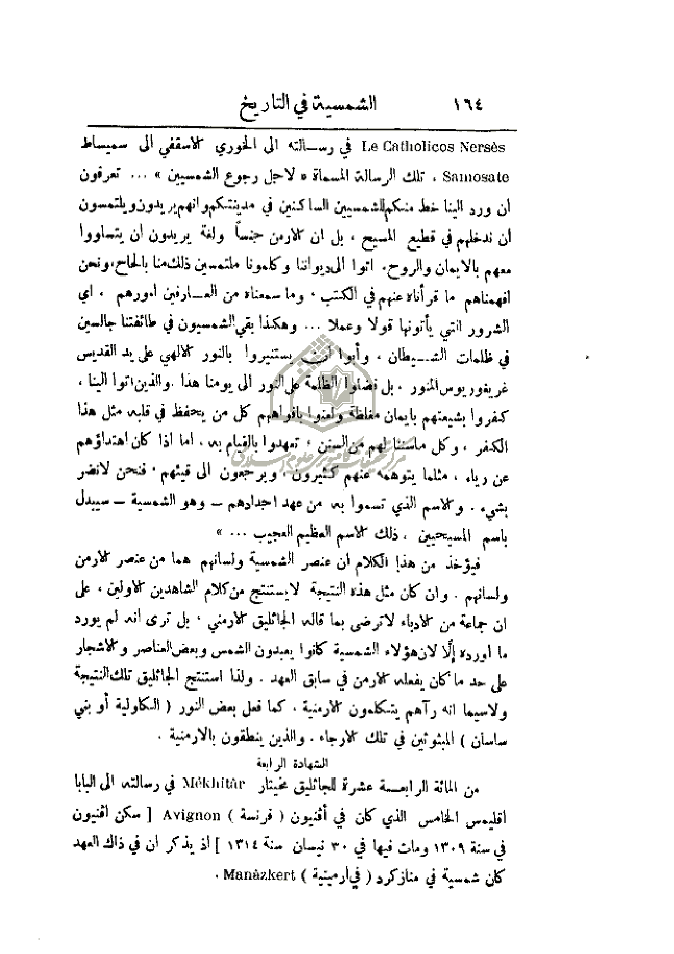 من المائة الربعة عشرة للجاثليق مخيتار في رسالته إلى البابا اقليمس الخامس الذي كان في أفنيون (فرنسة) (سكن افنيون في سنة 1309 ومات فيها في 30 نيسان سنة 1314) إذ يذكر أن في ذاك العهد كان شمسية في منازكرد (في أرمينية)