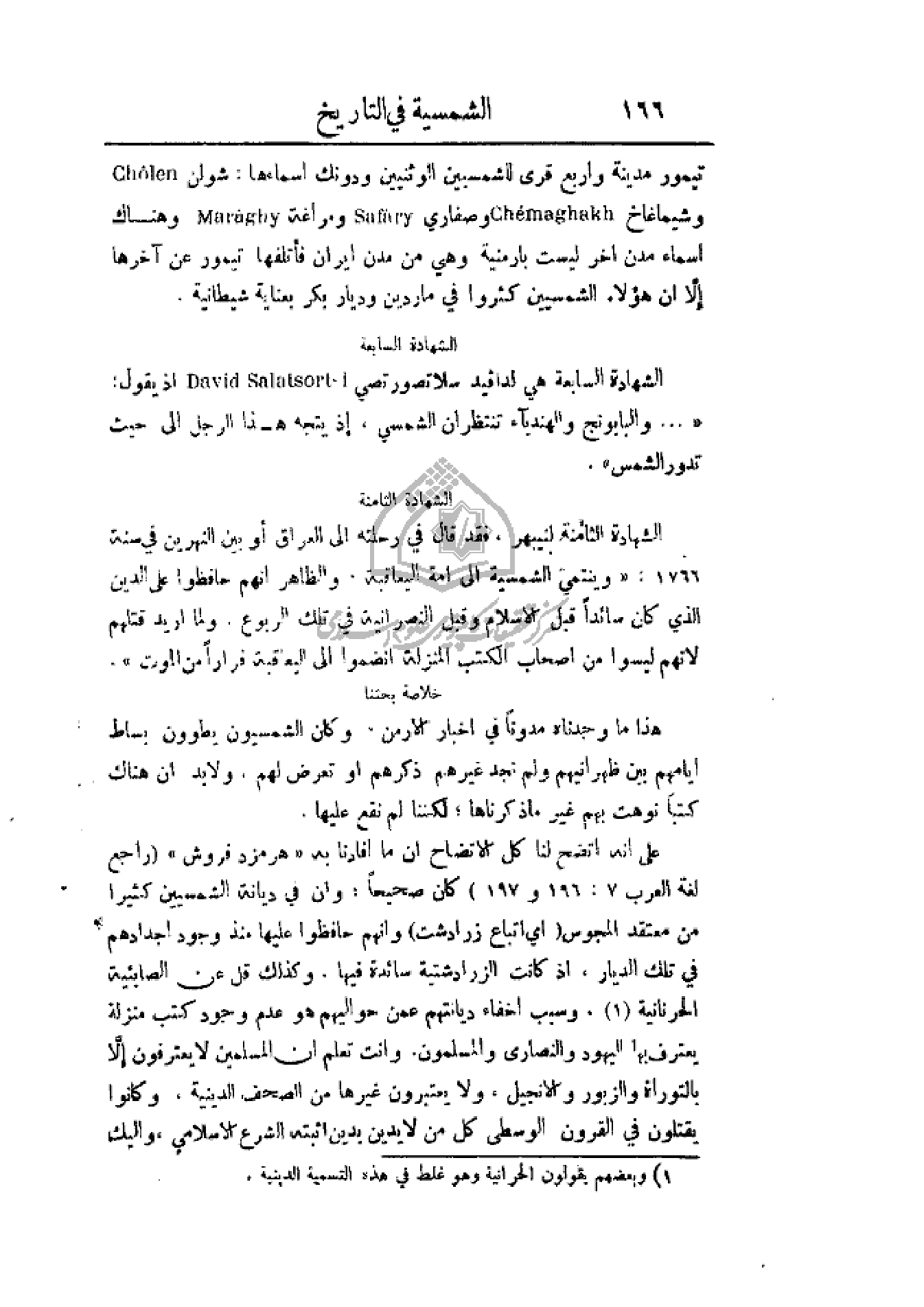 على انه اتضح لنا كل الاتضاح أن ما أفادنا به (هومزد فروش) (راجع لغة العرب 7: 196 و197) كان صحيحاً؛ وإن في ديانة الشمسيين كثيرا من معتقد المجوس (أي اتباع زرادشت) وانهم حافظوا عليها منذ وجود أجداهم في تلك الديار، إذا كانت الزرادشتية سائدة