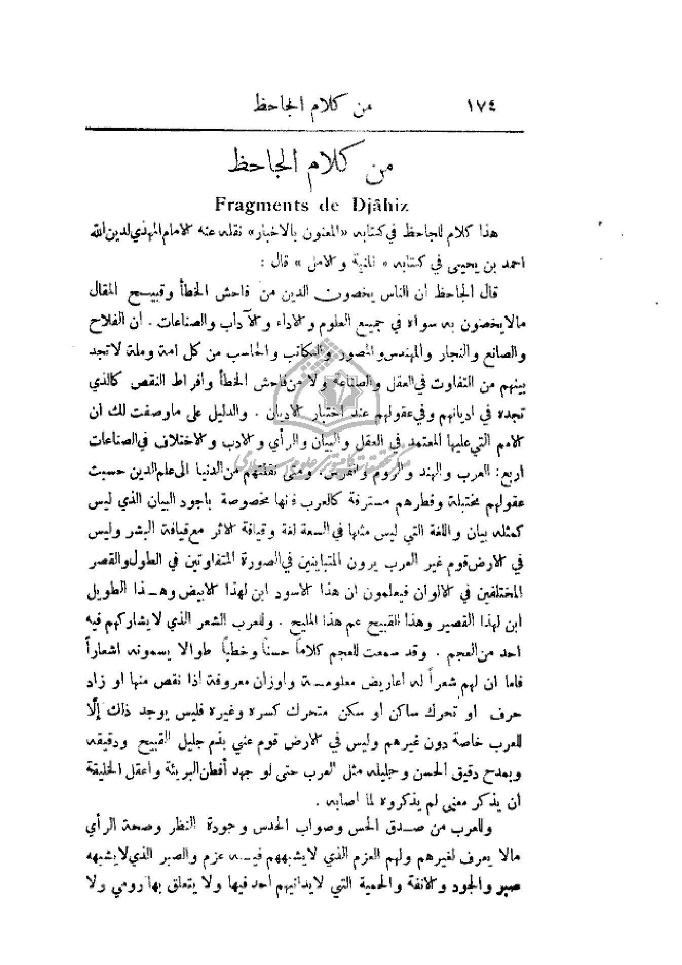قال الجاحظ أن الناس يخصون الدين من فاحش الخطأ وقبيح المقال ما لا يخصون به سواه في جميع العلوم والأداء والآداب والصناعات. إن الفلاح والصانع والنجار والمهندس والمصور والكاتب والحاسب من كل أمة وملة لا تجد بينهم من التفاوت في العقل والصناعة ولا من فاحش الخطأ وإفراط النقص كالذي تجده في أديانهم وفي عقولهم عند اختبار الأديان. والدليل على ما وصفت لك أن الأمم التي عليها المعتمد في العقل والبيان والرأي والأدب والاختلاف في الصناعات أربع: العرب والهند والروم والفرس. ومتى نقلتهم من الدنيا إلى علم الدين حسبت عقولهم مختبلة وفطرهم مسترفة كالعرب فأنها مخصوصة بأجود البيان الذي ليس كمثله بيان واللغة التي ليس مثلها في السعة لغة وقيافة الأثر مع قيافة البشر وليس في الأرض قوم غير العرب يرون المتباينين في الصورة المتفاوتين في الطول والقصر المختلفين في الألوان فيعلمون أن هذا الأسود ابن لهذا الأبيض وهذا الطويل ابن لهذا القصير وهذا القبيح عم هذا المليح. وللعرب الشعر الذي لا يشاركهم فيه أحد من العجم. وقد سمعت للعجم كلاماً حسناً وخطباً طوالاً يسمونه أشعاراً فأما أن لهم شعراً له اعاريض معلومة وأوزان معروفة إذا نقص منها أو زاد حرف أو تحرك ساكن أو سكن متحرك كسره وغيره فليس يوجد ذلك إلاَّ للعرب خاصة دون غيرهم وليس في الأرض قوم عني بذم جليل القبيح ودقيقه وبمدح دقيق الحسن وجليله مثل العرب حتى لو جهد أفطن البريئة واعقل الخليقة أن يذكر معنى لم يذكروه لما أصابه.