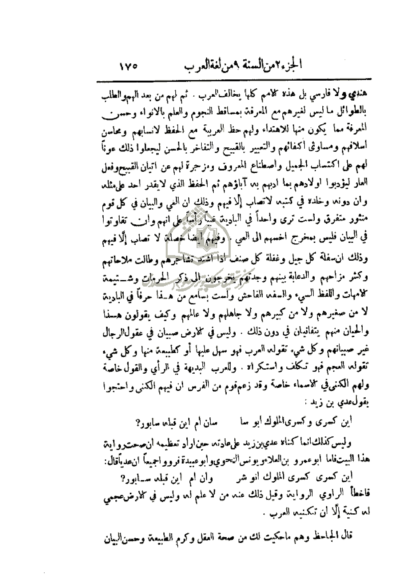 لأنسابهم ومحاسن أسلافهم ومساوئ اكفائهم والتعيير بالقبيح والتفاخر بالحسن ليجعلوا ذلك عوناً لهم على اكتساب الجميل واصطناع المعروف ومزجه لهم عن إتيان القبيح وفعل العار ليؤدبوا أولادهم بما أدبهم به آباؤهم ثم الحفظ الذي لا يقدر أحد على مثله وان دونه وخلده في كتبه لا تصاب إلاَّ فيهم وذلك أن العي والبيان في كل قوم منثور متفرق ولست ترى واحداً في البادية غبياً رأسا ً على انهم وان تفاوتوا في البيان فليس بمخرج أخسهم إلى العي. وفيهم أيضاً خصلة لا تصاب إلاَّ فيهم وذلك أن سفلة كل جيل وغفلة كل صنف إذا أشتد تشاجرهم وطالت ملاخاتهم وكثر مزاحهم والدعابة بينهم وجدتهم يخرجون إلى ذكر الحرمات وشتيمة الأمهات واللفظ السيئ والسفه الفاحش ولست بسامع من هذا حرفاً في البادية لا من صغيرهم ولا من كبيرهم ولا جاهلهم ولا عالمهم وكيف يقولون هذا والحيان منهم يتفانيان في دون ذلك. وليس في الأرض صبيان في عقول الرجال غير صبيانهم وكل شيء تقوله العرب فهو سهل عليها أو كطبيعة منها وكل شيء تقوله العجم فهو تكلف واستكراه. وللعرب البديهة في الرأي والقول خاصة ولهم الكنى في الأسماء خاصة وقد زعم قوم من الفرس أن فيهم الكنى واحتجوا بقول عدي بن زيد: