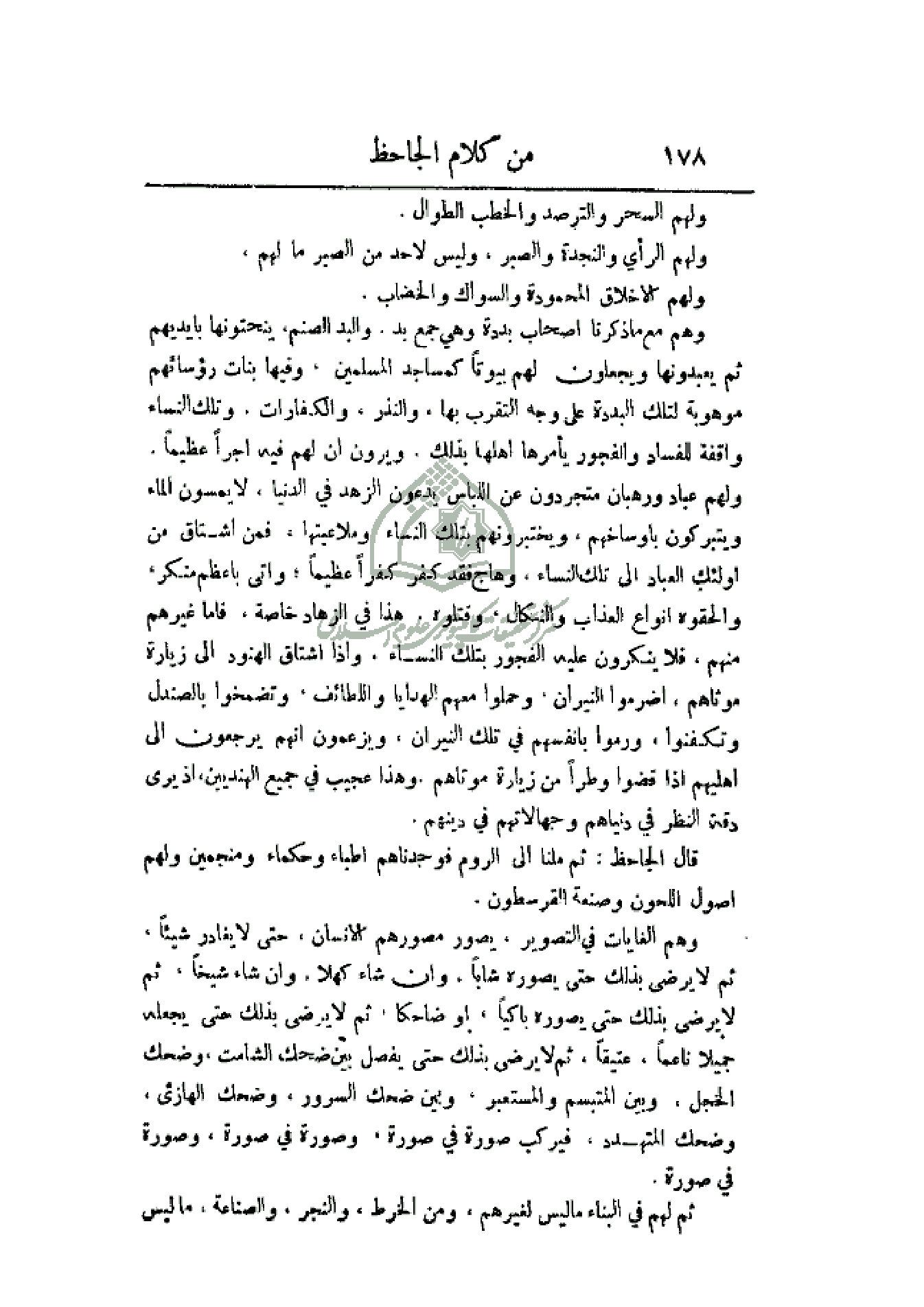 وهم الغايات في التصوير، يصور مصورهم الإنسان، حتى لا يغادر شيئاً، ثم لا يرضى بذلك حتى يصوره شاباً، وان شاء كهلا، وان شاء شيخاً، ثم لا يرضى بذلك حتى يصوره باكياً، أو ضاحكاً، ثم لا يرضى بذلك حتى يجعله جميلا ناعماً، عتيقاً، ثم لا يرضى بذلك حتى يفصل بين ضحك الشامت، وضحك الخجل، وبين المتبسم والمستعبر، وبين ضحك السرور، وضحك الهازئ وضحك المتهدد، فيركب صورة في صورة، وصورة في صورة، وصورة في صورة.