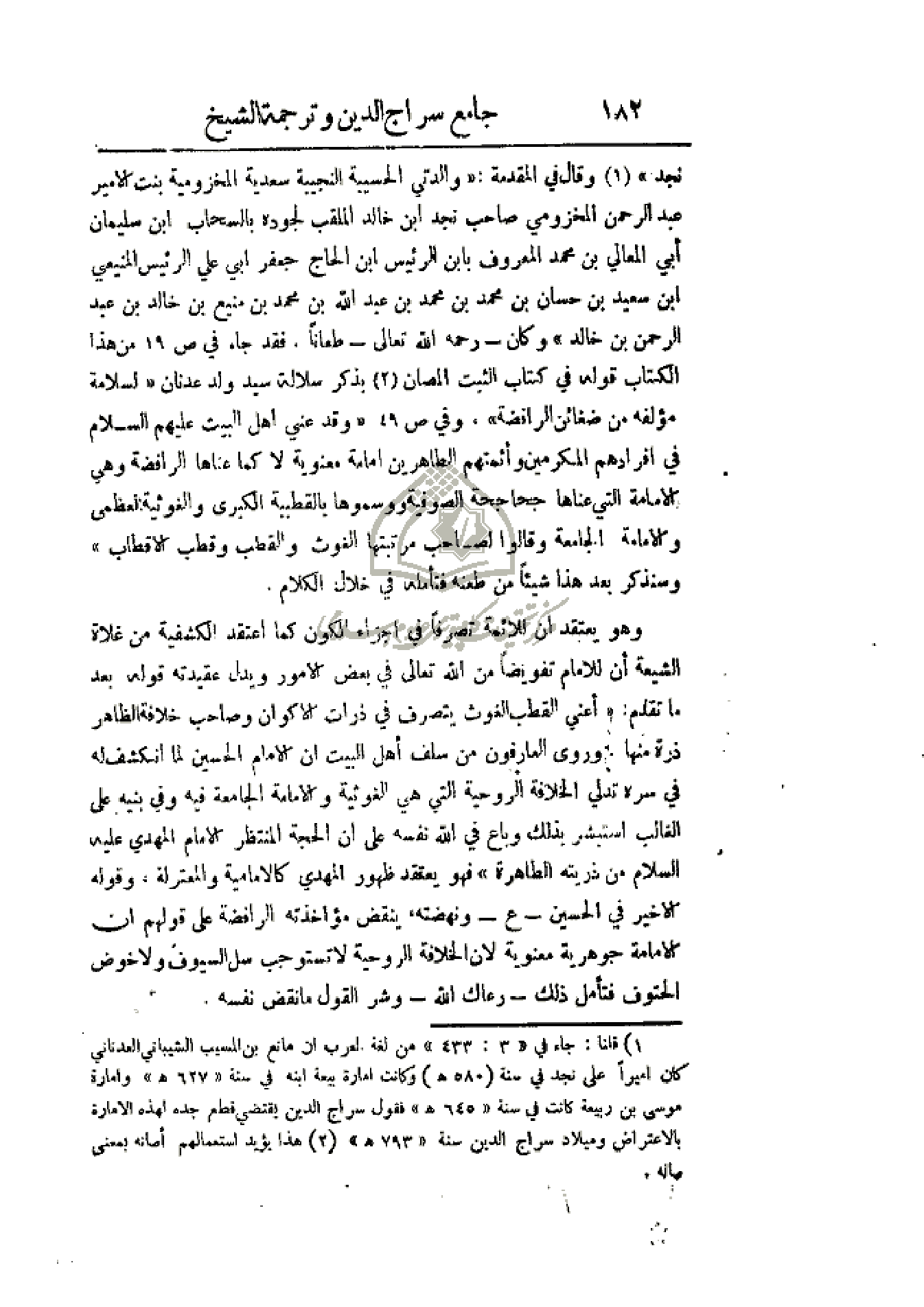 منيع بن خالد بن عبد الرحمن بن خالد) وكان - رحمه الله تعالى - طعاناً. فقد جاء في ص 19 من هذا الكتاب قوله في كتاب الثبت المصانبذكر سلالة سيد ولد عدنان (لسلامة مؤلفه من ضغائن الرافضة)، وفي ص 49 (وقد عني أهل البيت عليهم السلام في إفرادهم المكرمين وأئمتهم الطاهرين إمامة معنوية لا كما عناها الرافضة وهي الإمامة التي عناها جحاجحة الصوفية ووسموها بالقطبية الكبرى والغوثية العظمى والإمامة الجامعة وقالوا لصاحب مرتبتها الغوث والقطب وقطب الأقطاب) وسنذكر بعد هذا شيئاً من طعنه فتأمله في خلال الكلام.