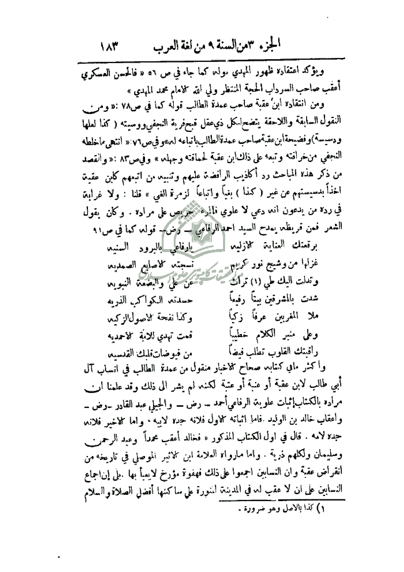 ومن انتقاده ابن عقبة صاحب عمدة الطالب قوله كما في ص 78: (ومن النقول السابقة واللاحقة يتضح لكل ذي عقل قبح فرية النجفي ووسيته (كذا لعلها ودسيسة) وفضيحة ابن عقبة صاحب عمدة الطالب باتباعه له) وفي ص 76 (انتهى ما خلطه النجفي من خرافته وتبعه على ذلك ابن عقبة لحماقته وجهله) وفي ص 83: (والقصد من ذكر هذه المباحث رد أكاذيب الرافضة عليهم وتنبيه من اتبعهم كابن عقبة أخذاً بدسيستهم عن غير (كذا) بغياً واتباعاً لزمرة الغي) قلنا: ولا غرابة في رده من يدعون انه دعي لا علوي فالمرء حريص على مراده. وكان يقول الشعر فمن قريظة يمدح السيد أحمد الرفاعي - رض - قوله كما