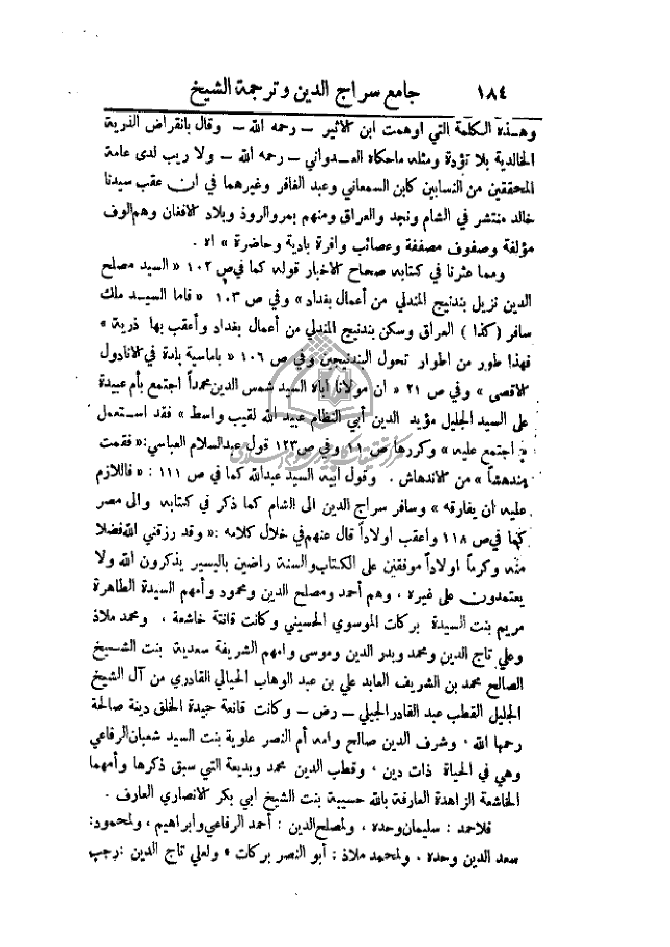 واسط) فقد استعمل (اجتمع عليه) وكررها ص 11 وفي ص 123 قول عبد السلام العباسي: (فقمت مندهشاً) من الاندهاش. وقول أبيه السيد عبد الله كما في ص 111: (فاللازم عليه أن يفارقه) وسافر سراج الدين إلى الشام كما ذكر في كتابه والى مصر كما في ص 118 وأعقب أولاداً قال عنهم في خلال كلامه: (وقد رزقني الله فضلا منه وكرماً أولاداً موفقين على الكتاب والسنة راضين باليسير يذكرون الله ولا يعتمدون على غيره، وهم أحمد ومصلح الدين ومحمود وأمهم السيدة الطاهرة مريم بنت السيدة بركات الموسوي الحسيني وكانت قانتة خاشعة، ومحمد ملاذ وعلي تاج الدين ومحمد وبدر الدين وموسى وأمهم الشريفة سعدية بنت الشيخ الصالح محمد بن الشريف العابد علي بن عبد الوهاب الحيالي القادري من آل الشيخ الجليل القطب عبد القادر الجيلي - رض - وكانت قانعة جيدة الخلق دينه صالحة رحمها الله، وشرف الدين صالح وأمه أم النصر علوية بنت السيد شعبان الرفاعي وهي في الحياة ذات دين، وقطب الدين محمد وبديعة التي سبق ذكرها وأمهما الخاشعة الزاهدة العارفة بالله حسيبة بنت الشيخ أبي بكر الأنصاري العارف.