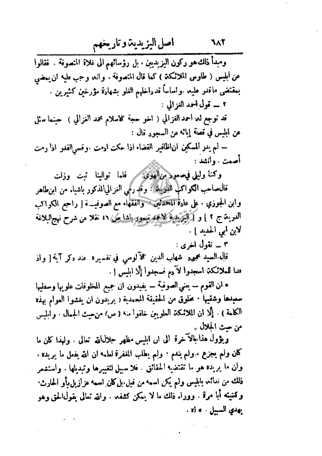 قال صاحب الكواكب الدرية: وقد رمي الغزالي المذكور بأشياء من ابن طاهر وابن الجوزي، على عادة المحدثين، والفقهاء مع الصوفية (راجع الكواكب الدرية ج2) و (اليزيدية لأحمد تيمور ص 46 نقلا عن شرح نهج البلاغة لأبن أبي الحديد).
