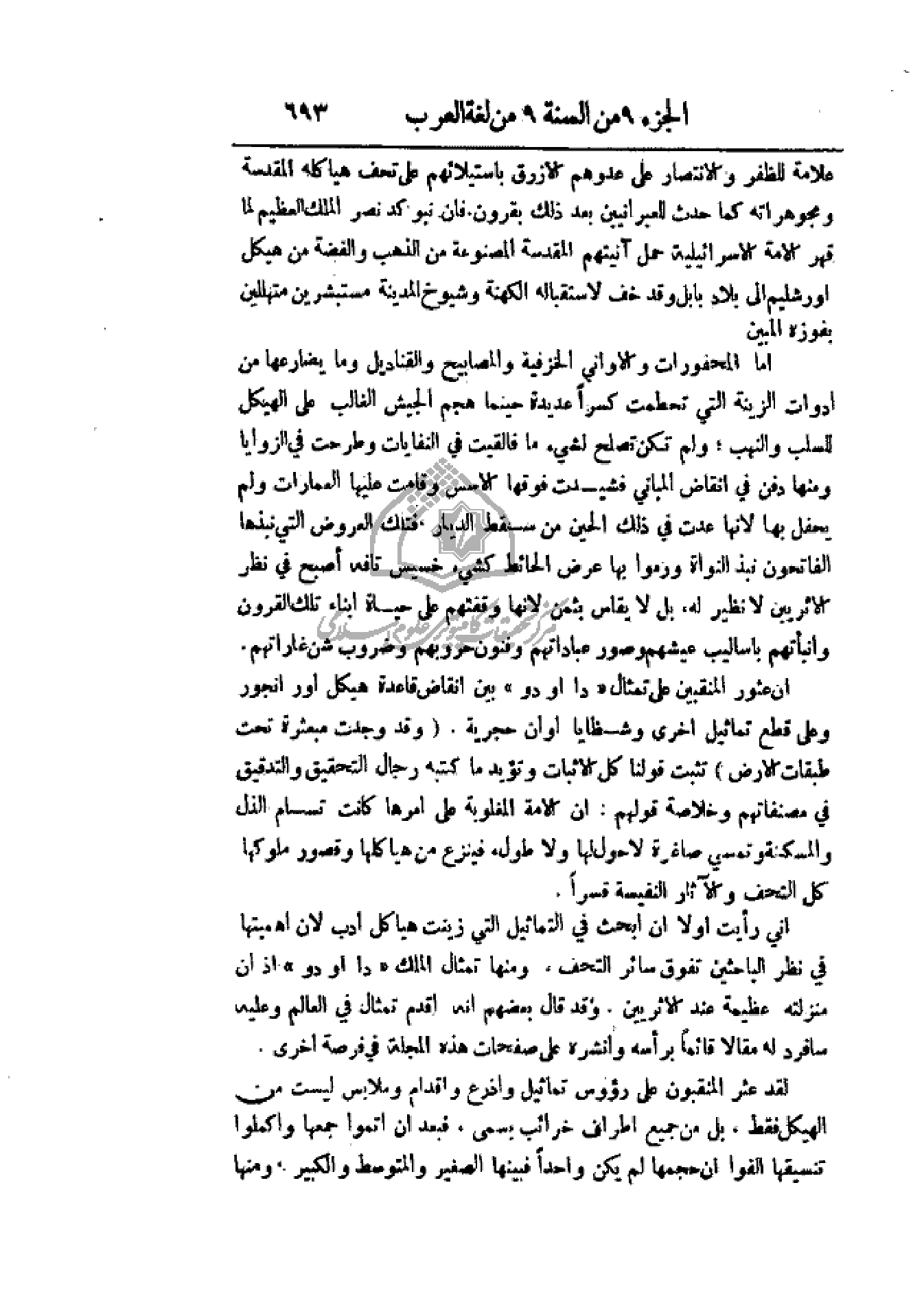 أما المحفورات والأواني الخزفية والمصابيح والقناديل وما يضارعها من أدوات الزينة التي تحطمت كسراً عديدة حينما هجم الجيش الغالب على الهيكل للسلب والنهب؛ ولم تكن تصلح لشيء ما فألقيت في النفايات وطرحت في الزوايا ومنها دفن في أنقاض المباني فشيدت فوقها الأسس وقامت عليها العمارات ولم يحفل بها لأنها عدت في ذلك الحين من سقط الديار، فتلك العروض التي نبذها الفاتحون نبذ النواة ورموا بها عرض الحائط كشيء خسيس تافه أصبح في نظر الأثريين لا نظير له، بل لا يقاس بثمن لأنها وقفتهم على حياة أبناء تلك القرون وأنبأتهم بأساليب عيشتهم وصور عباداتهم وفنون حروبهم وضروب من شن غاراتهم.